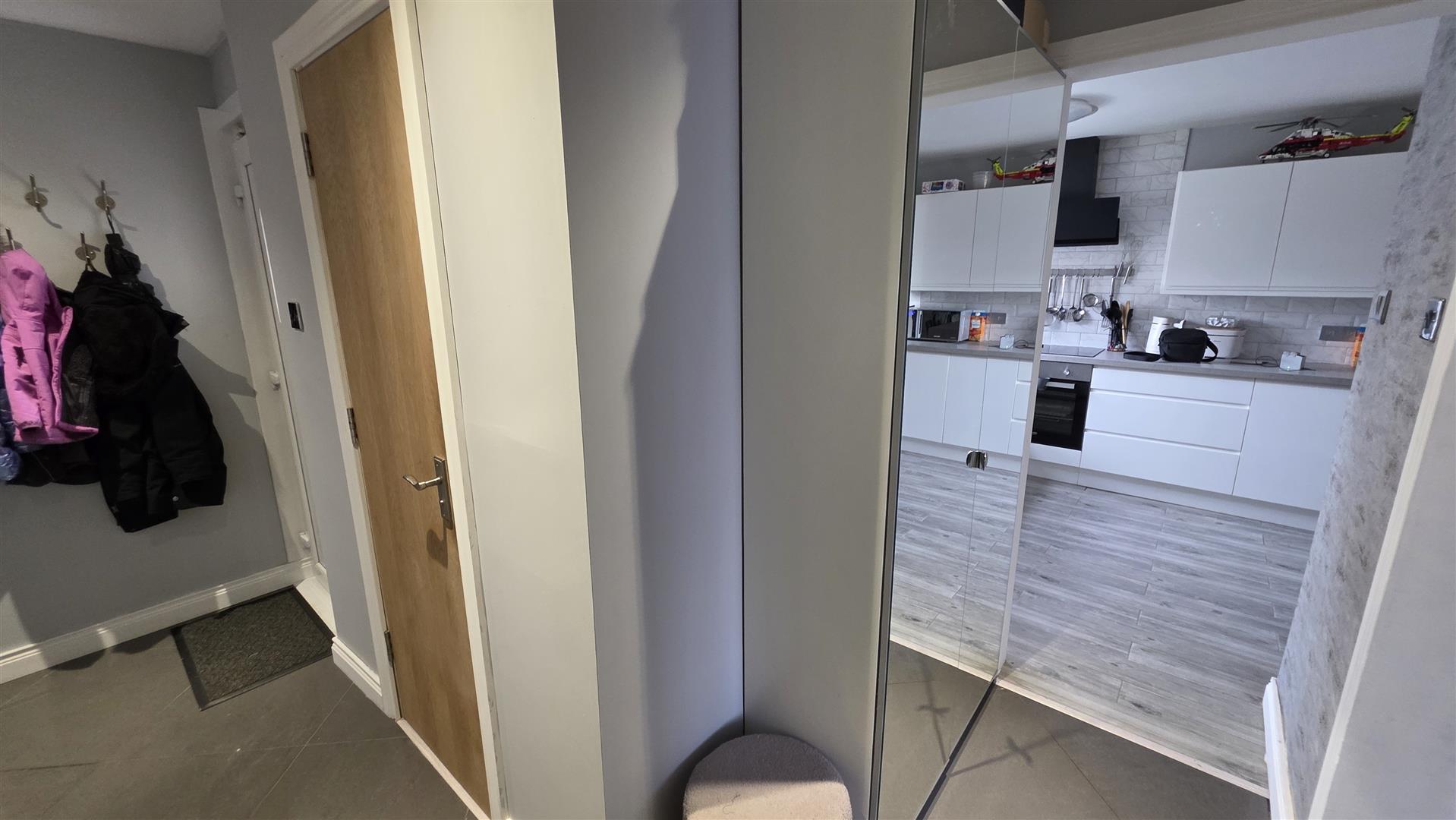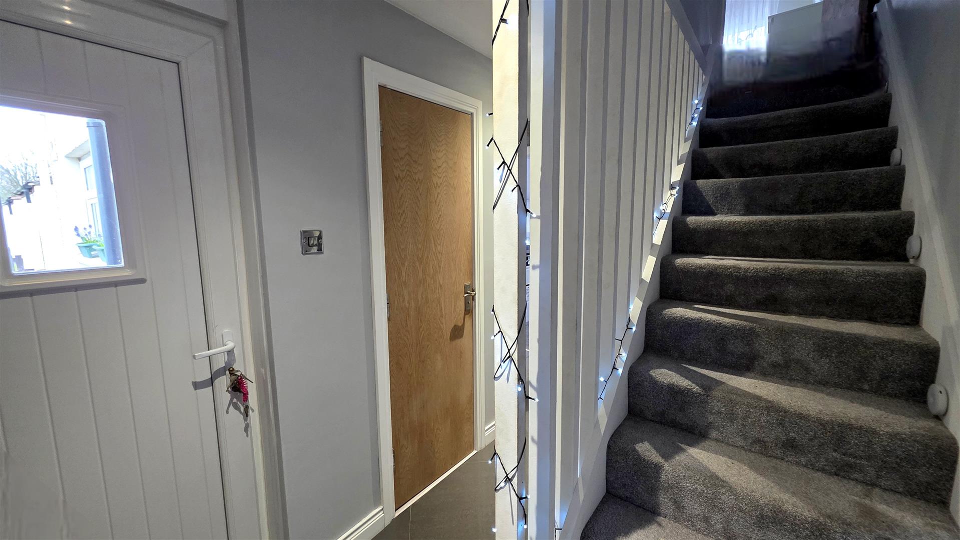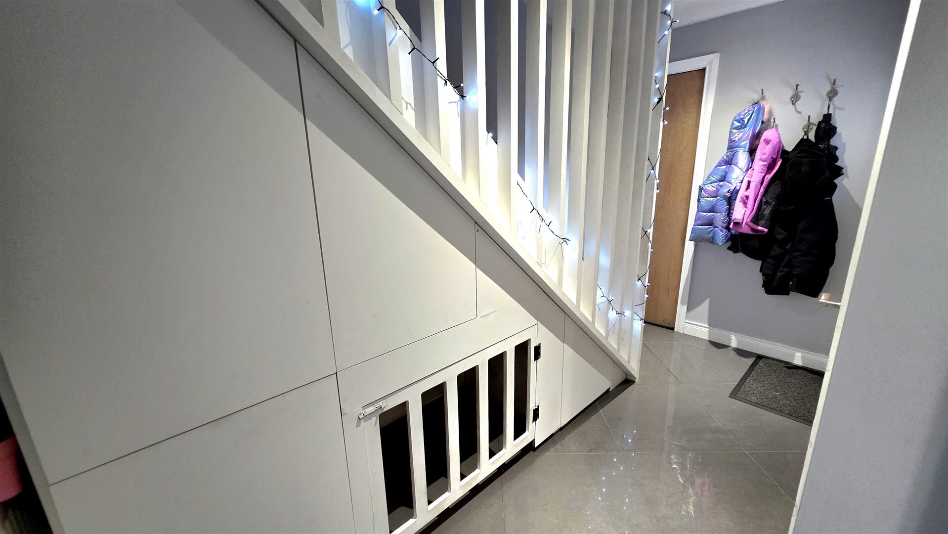 PVC double glazed door to entrance hall with fully tiled flooring. Staircase to first floor. Large storage cupboard with fully tiled flooring, power and lighting. Understairs dog house or storage. Low voltage down lighting. Double radiator.