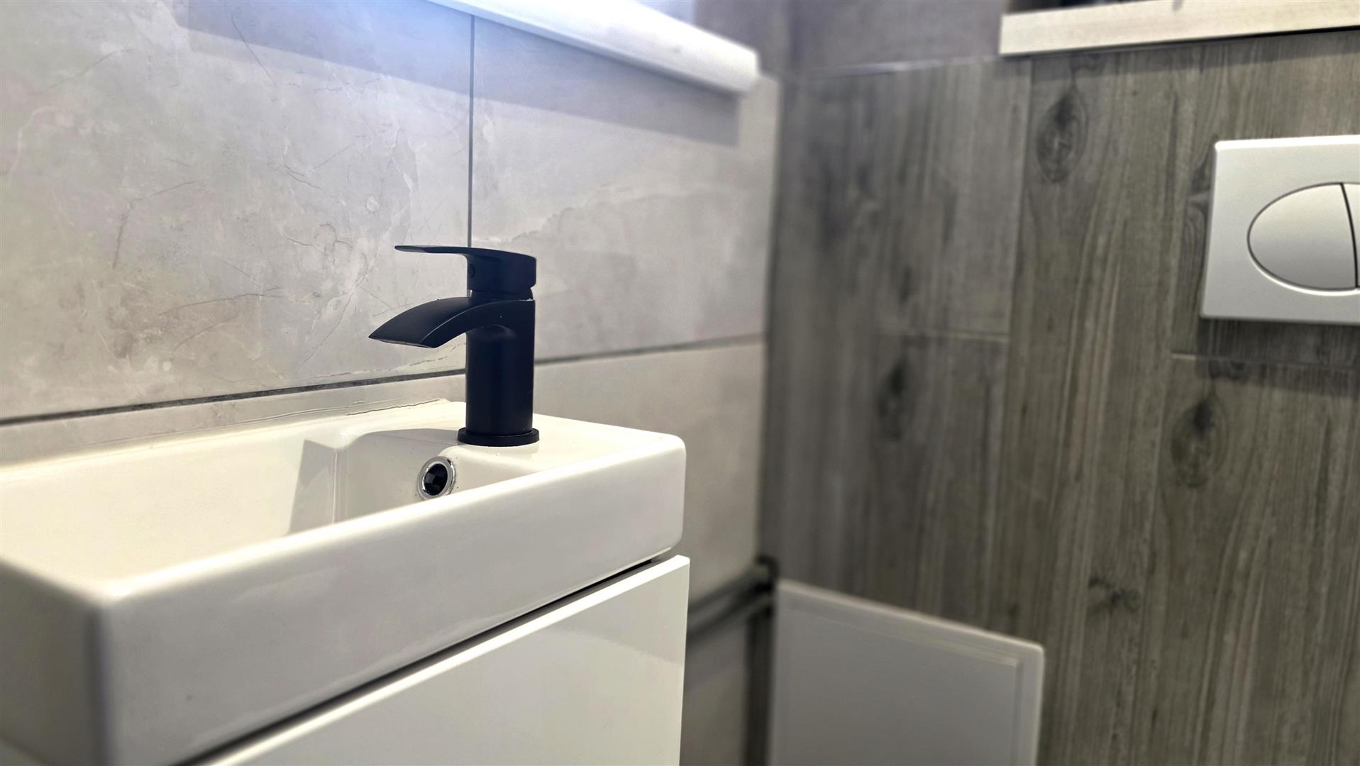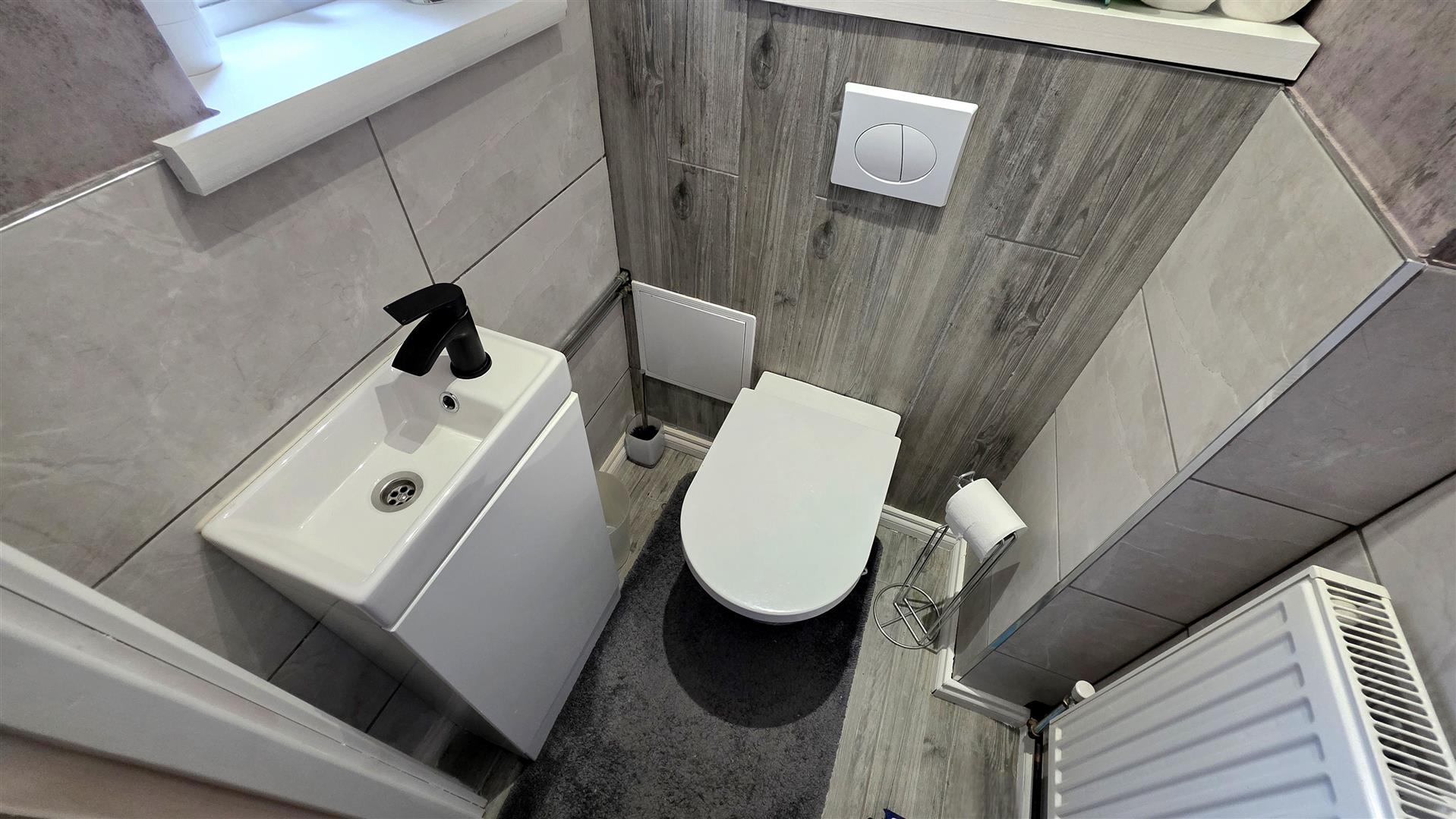 Modern white suite comprising a wall mounted low flush push button WC, a slim slim line wash hand basin with black 'Monobloc' mixer tap and storage below. Fully tiled flooring and partially tiled walls. Single radiator.
