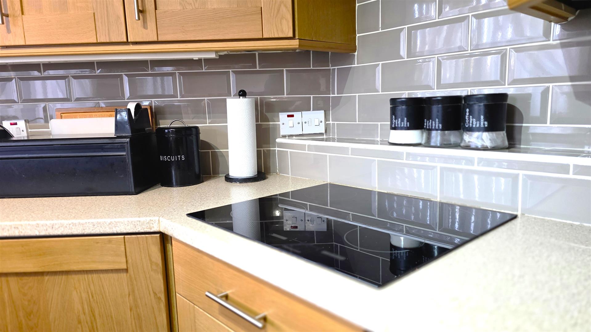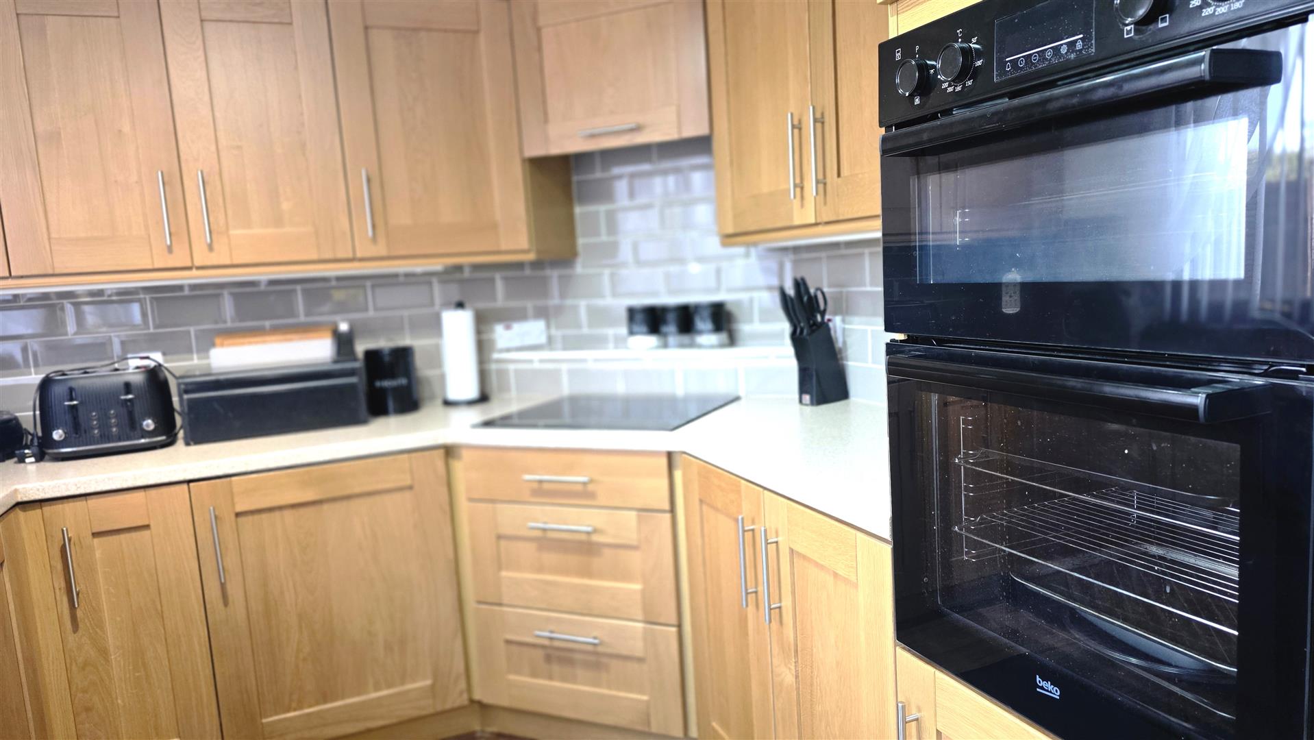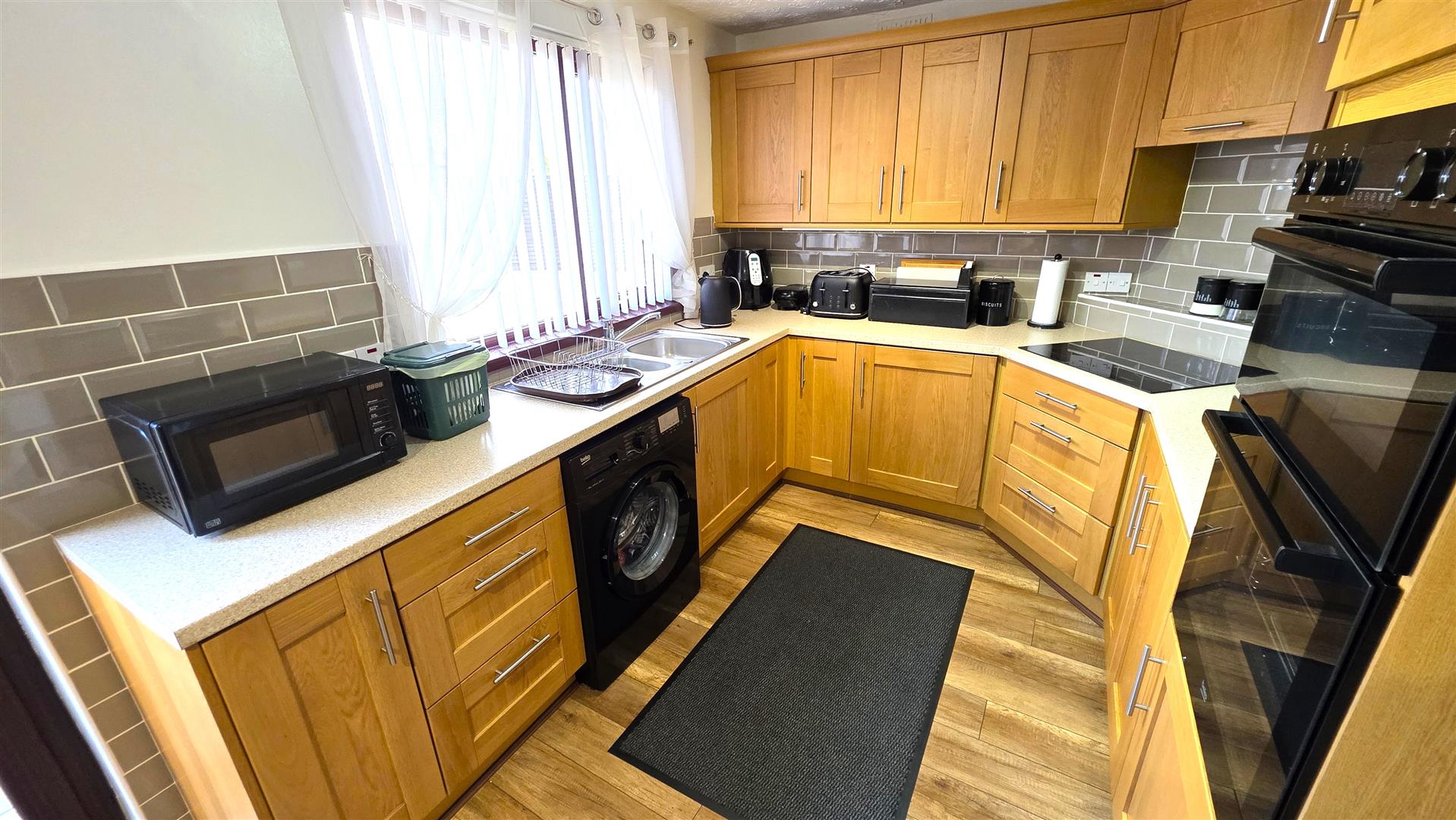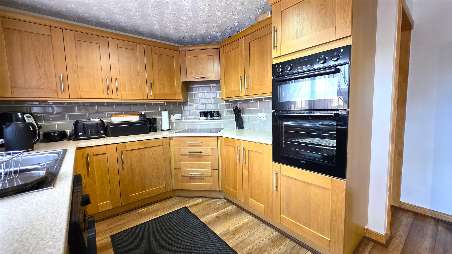 Full range of solid oak shaker style, high and low level kitchen units with complimentary work surfaces and bevered subway style, splashback, tiling. One and one quarter bowl stainless steel sink unit with chrome mixer tap. Integrated four ring halogen hub with hooded overhead extractor fan. Integrated mid level double oven and grill. Space for fridge freezer and washing machine. Wood laminate flooring. Mahogany affect PVC, double glazed, sliding patio door to rear. Single radiator.