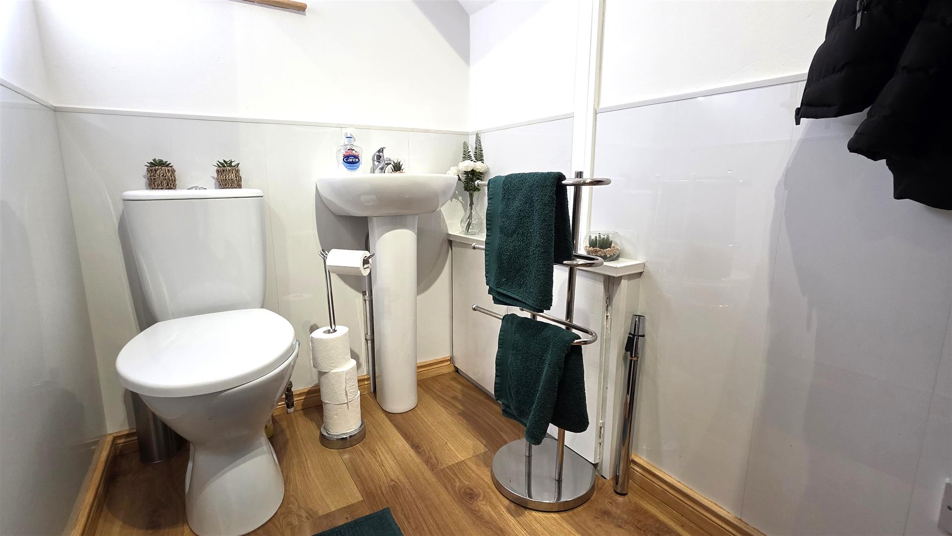 Modern white suite prising, a pedestal wash hand basin with chrome 'Monobloc' mixer tap. A low flush push button WC. Partial PVC wall panelling. Wood laminate flooring. Electric meter cupboard.