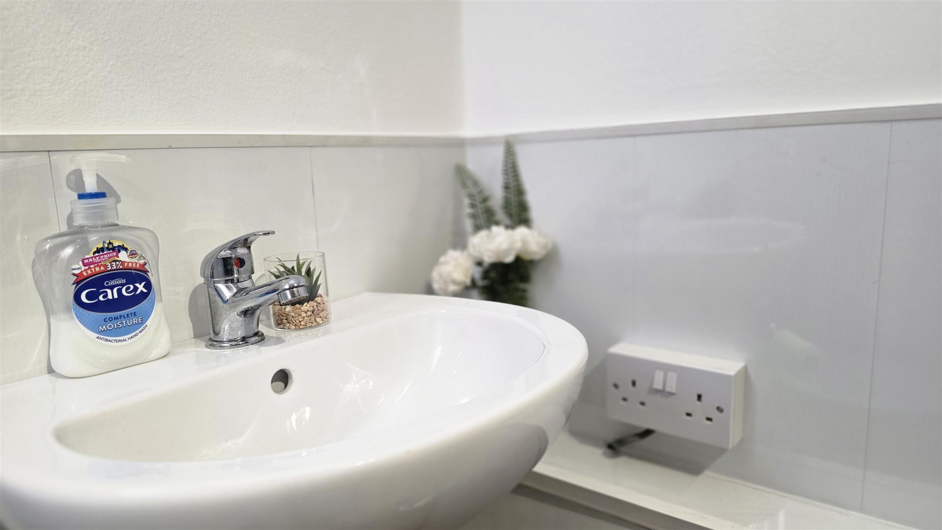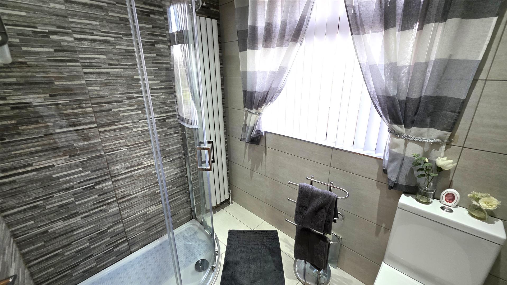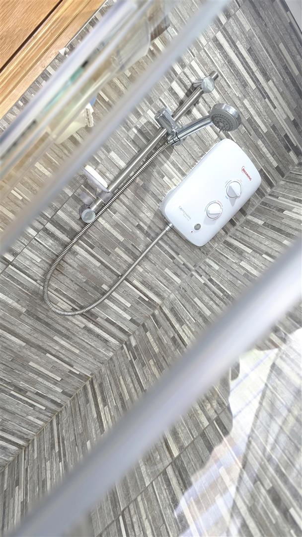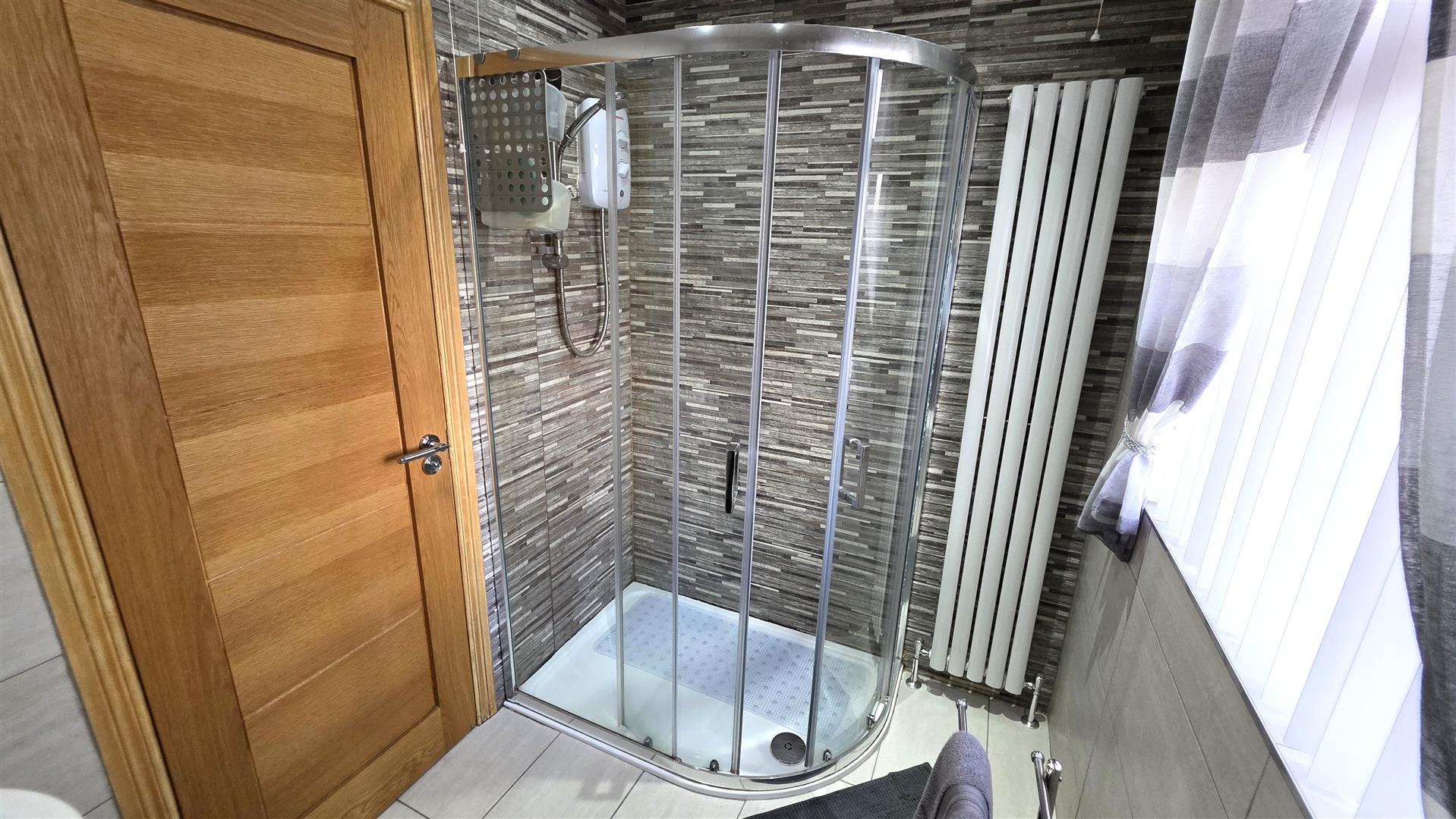 Modern white suite comprising a large enclosed shower with feature tiled splashback, 'Redring expressions' electric shower and partially glazed sliding door. A 'Vanity' wash hand basin with chrome 'Monobloc' mixer tap and storage below. A low flush push button WC. Fully tiled walls and fully tiled flooring. Low voltage downlighting. Extractor fan. Designer vertical radiator.