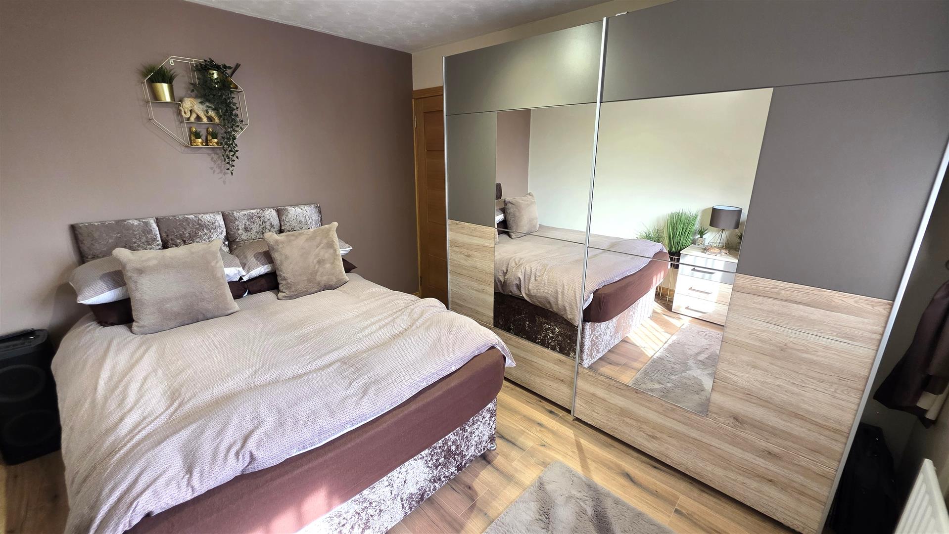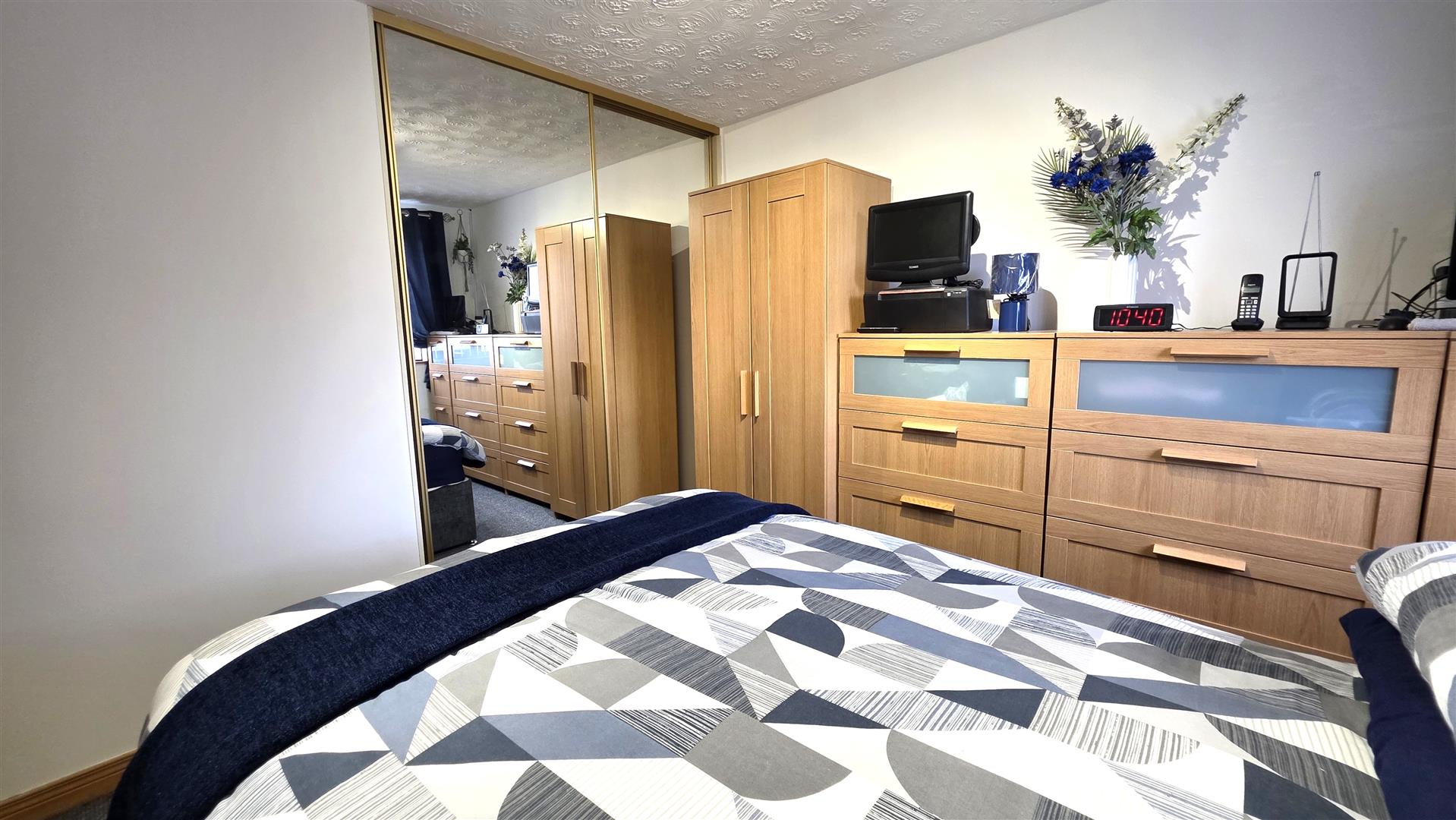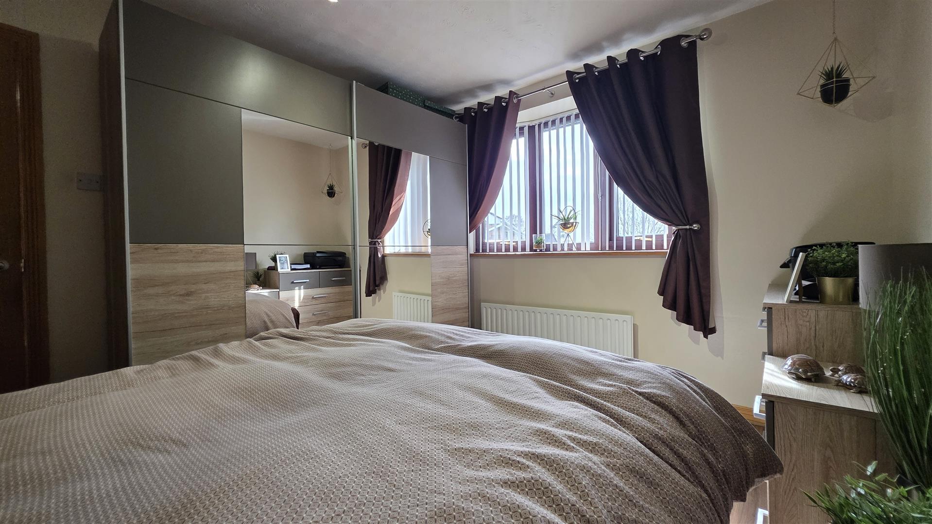 Integrated bedroom storage with sliding mirror doors. Single radiator.