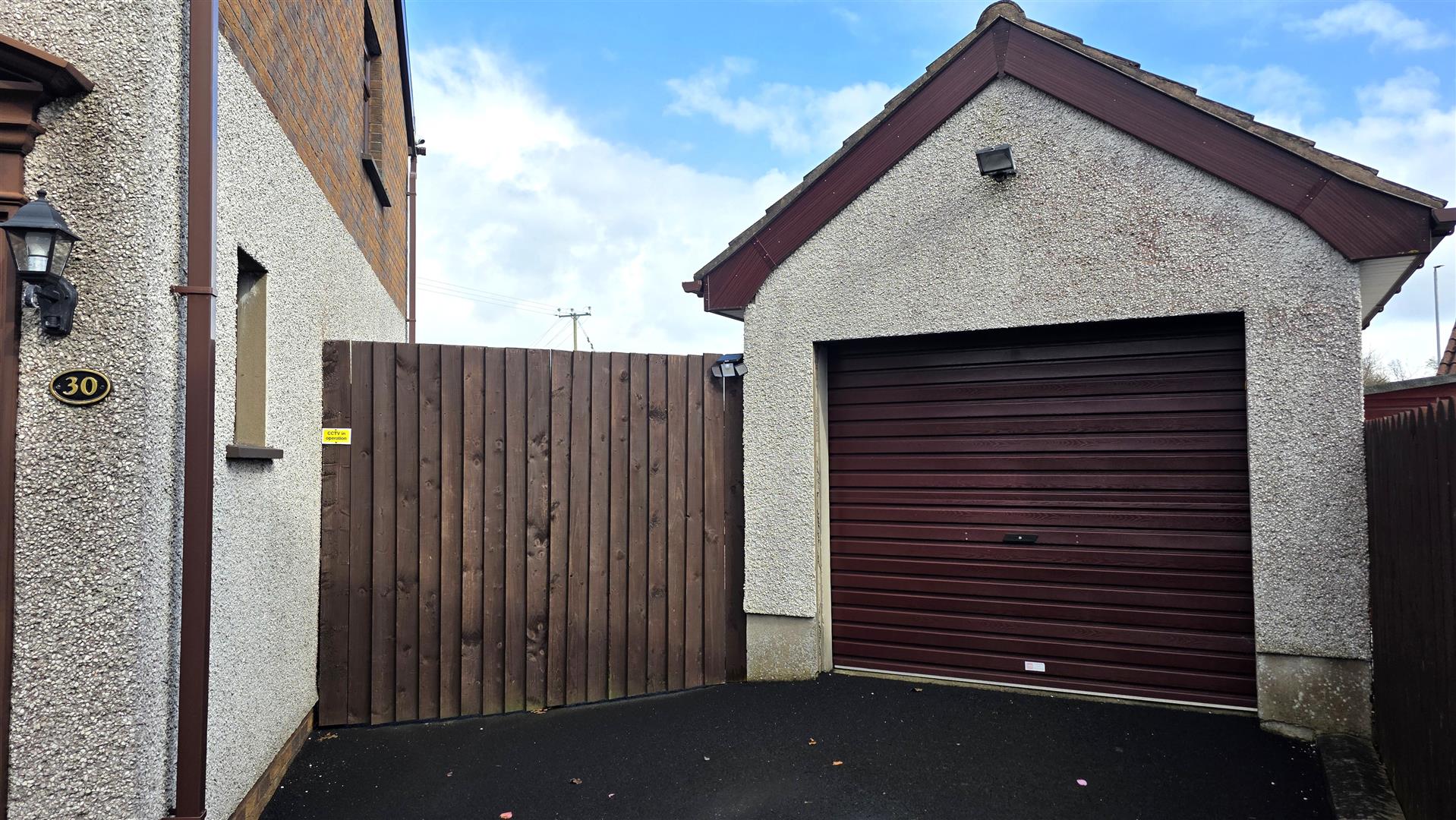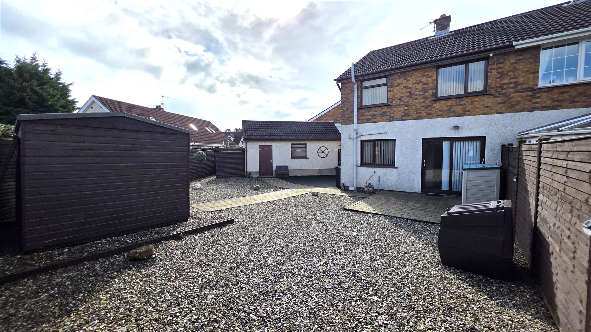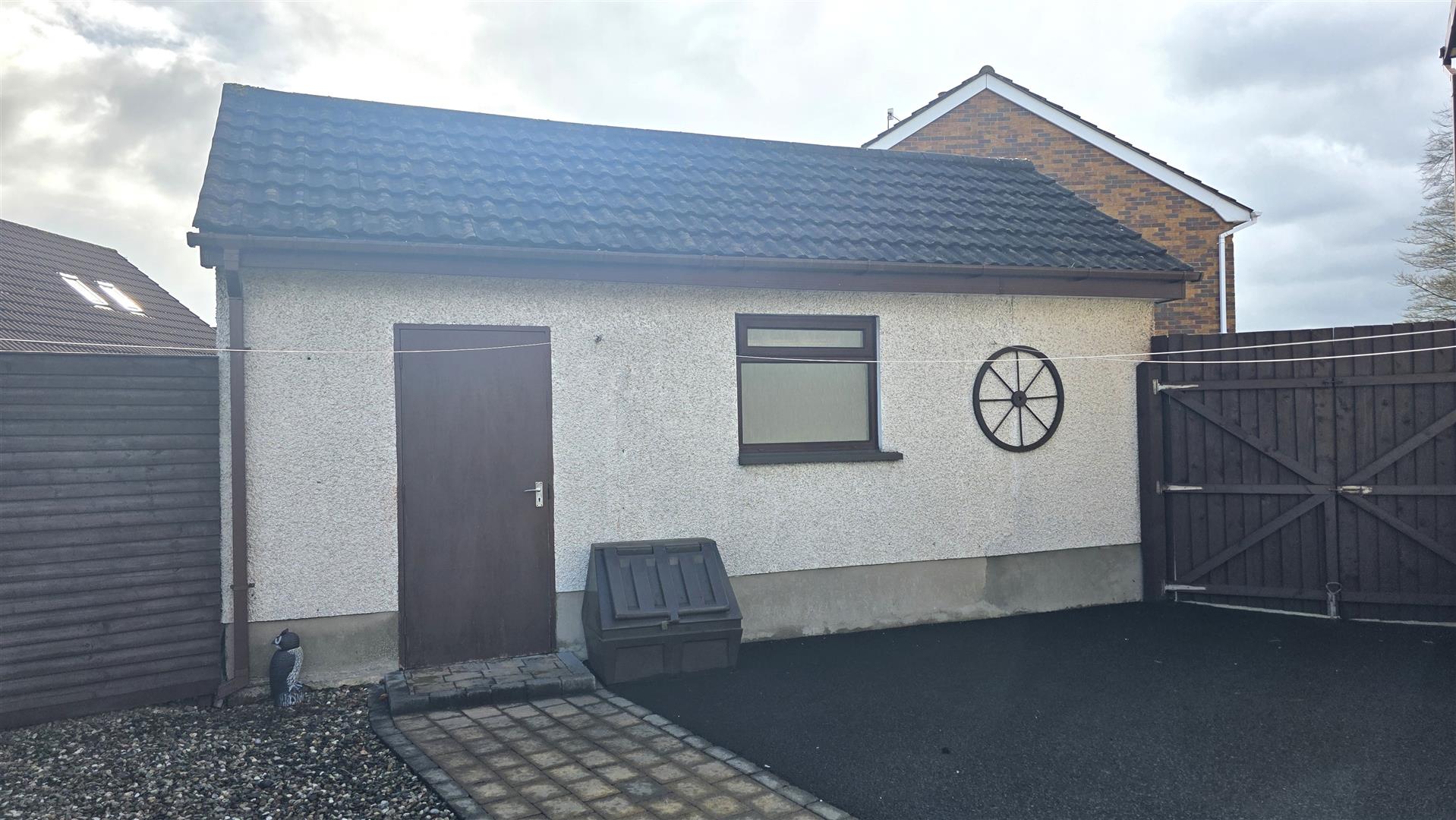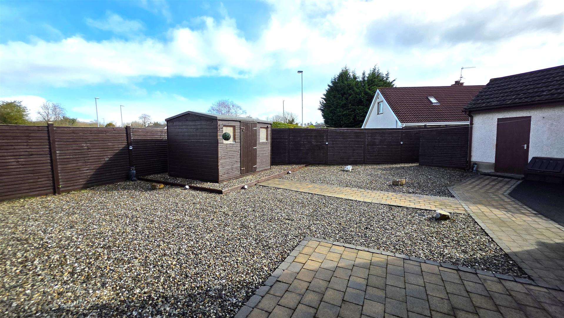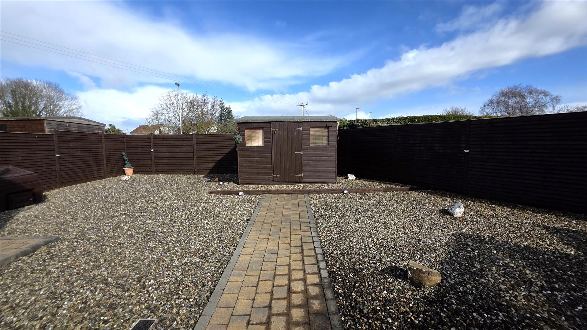 Fully enclosed and low maintenance rear garden, offering exceptional privacy. Large paved patio and mixed stone bedding. Paved pathway leading to garden shed and garage. Outside tap and outside lighting. 6 ft timber fencing and double gates to front.