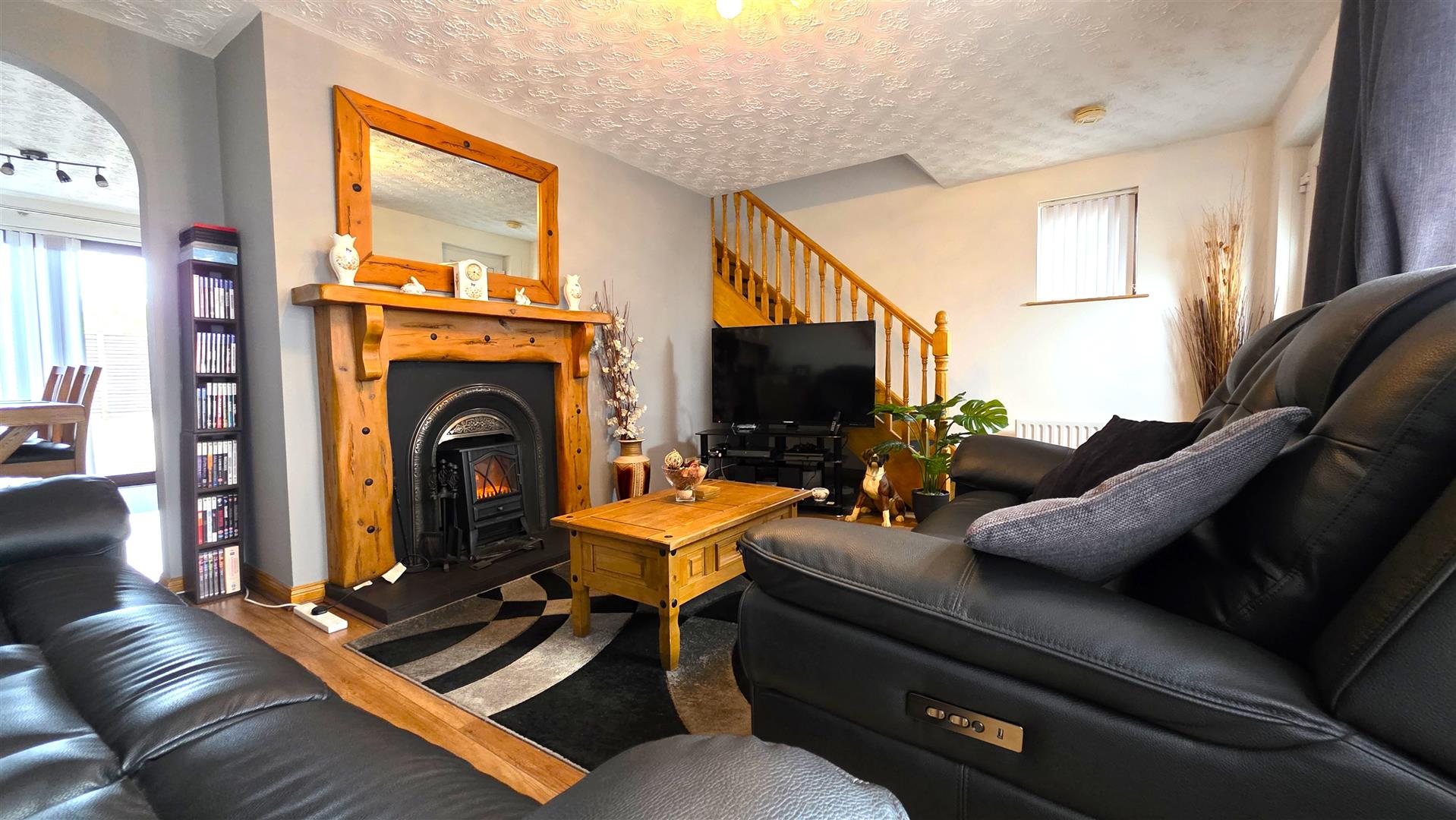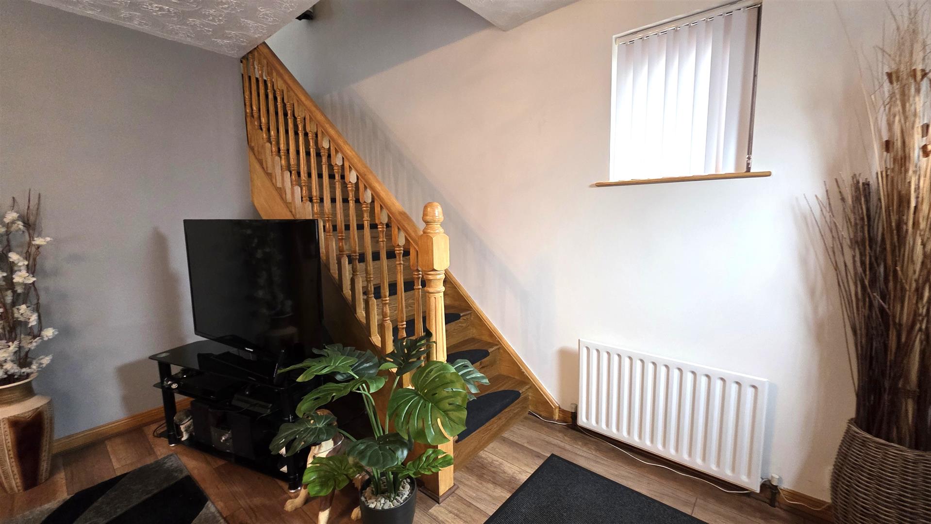 Open fire with back boiler, cast iron inset, decorative wooden surround and slate effect tiled hearth. Solid Oak Staircase to first floor with moulded, handrail and turned balustrading. Wood laminate flooring. Single radiator. Arch open to;