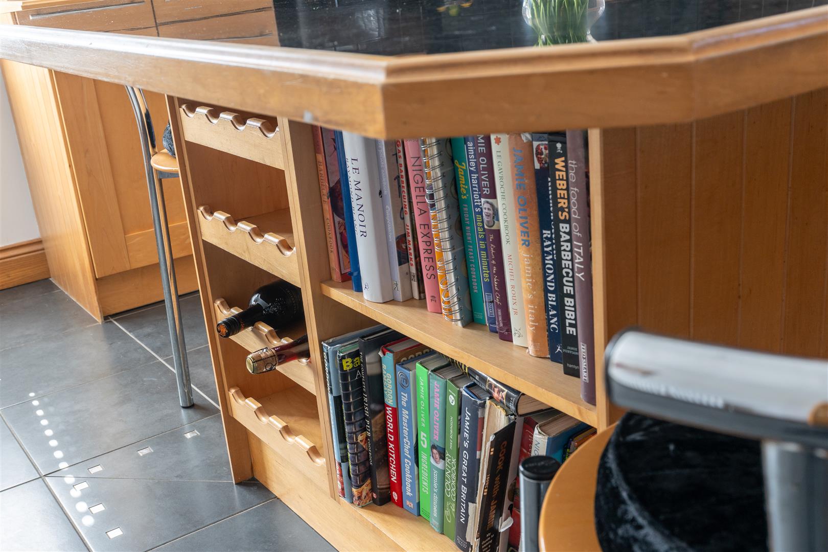 Full range of solid oak 'Shaker' style, high and low level kitchen units with contrasting work surfaces and splashback tiling. Display cabinets with integrated lighting. Over counter lighting. Matching kitchen island with additional storage, wine wrack and breakfast bar style seating. One and a quarter bowl stainless steel sink unit with shower mixer tap and pelmet lighting over. Integrated appliances to include a five ring gas hob with 'Neff' stainless steel overhead extractor fan. A mid level 'Neff' combination oven and grill. A 'Neff' microwave and dishwasher. Separate utility area with matching kitchen units and work surfaces featuring an integrated washing machine and tumble dryer. Larder cupboard. Space for fridge freezer. Fully tiled flooring. Low voltage downlighting. Double radiator. PVC double glazed door to the rear.