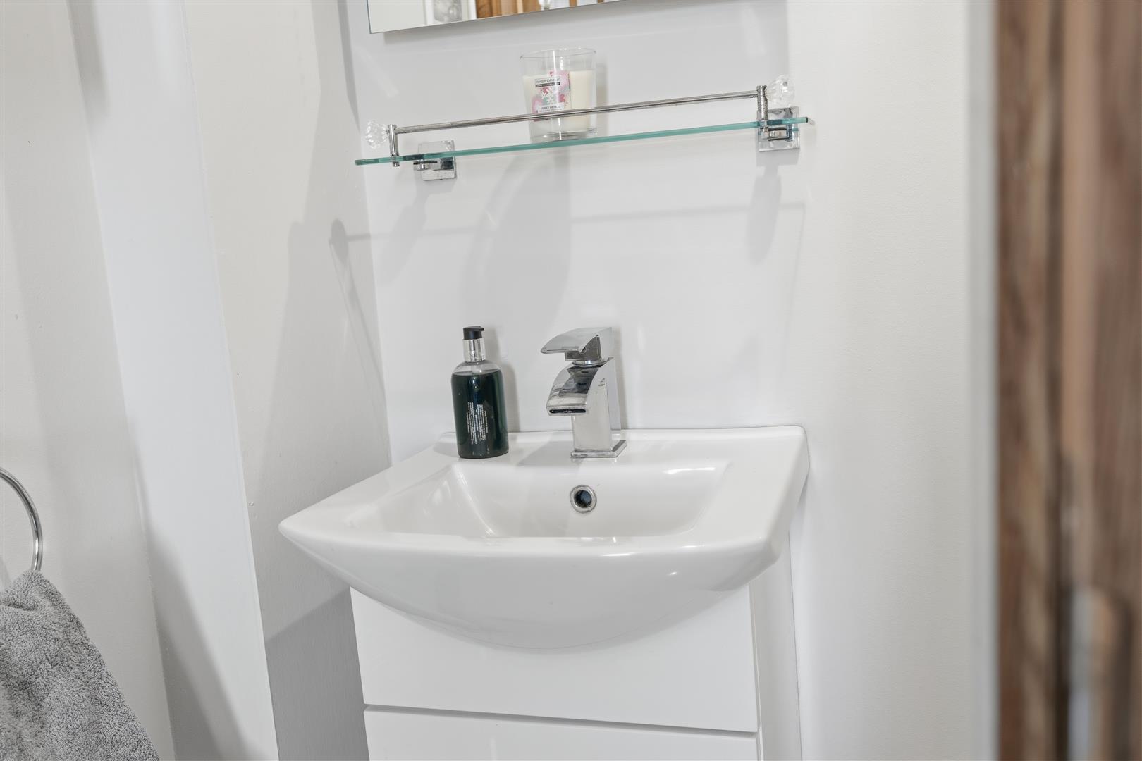 Modern white suite comprising an enclosed quadrant corner shower featuring a power shower with rainfall shower head, secondary attachment and partially glazed doors. A 'Vanity' wash hand basin with chrome 'Monobloc' mixer tap and LED touch sensitive backlit mirror with european power sockets. A low flush push button WC. Extractor fan. Fully tiled flooring and mostly tiled walls. Chrome towel radiator.
