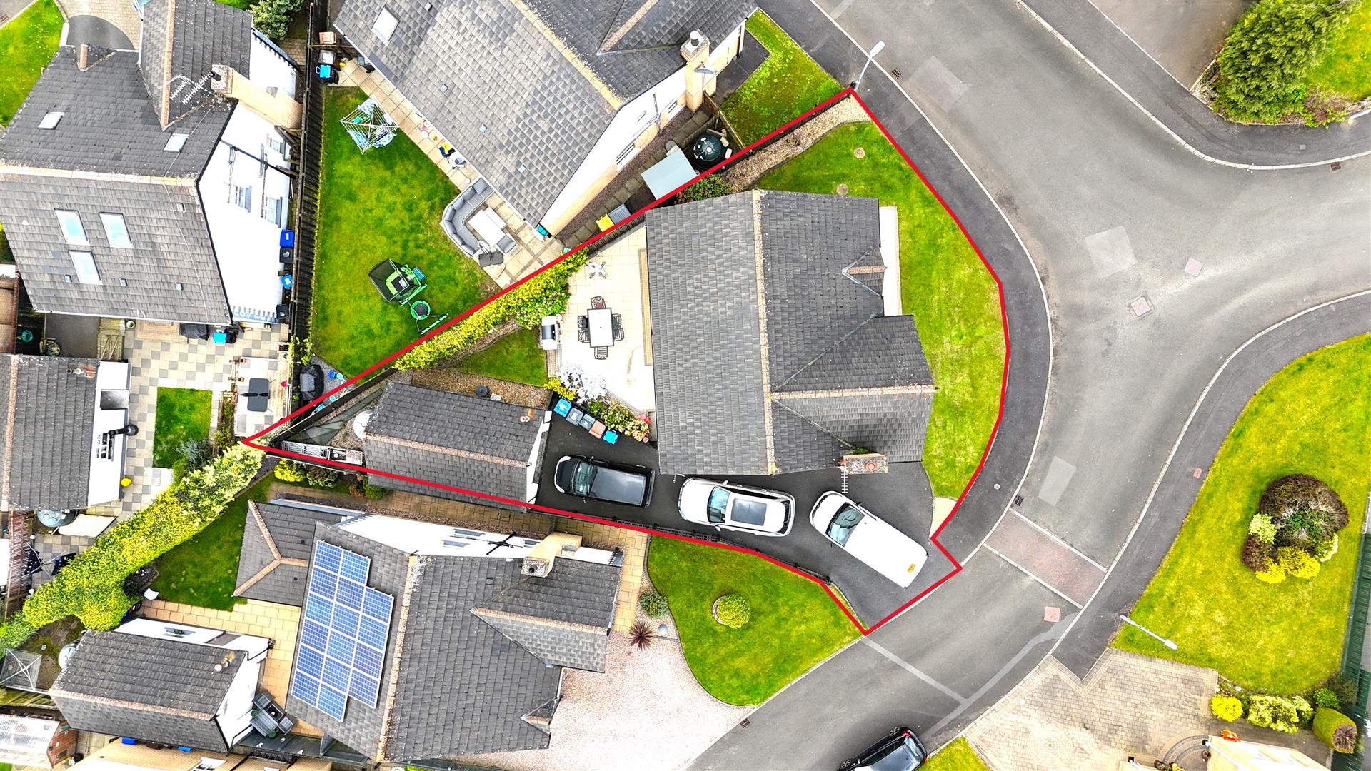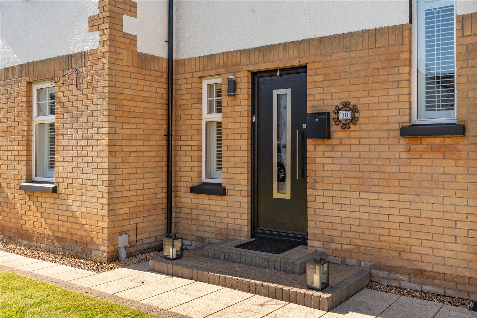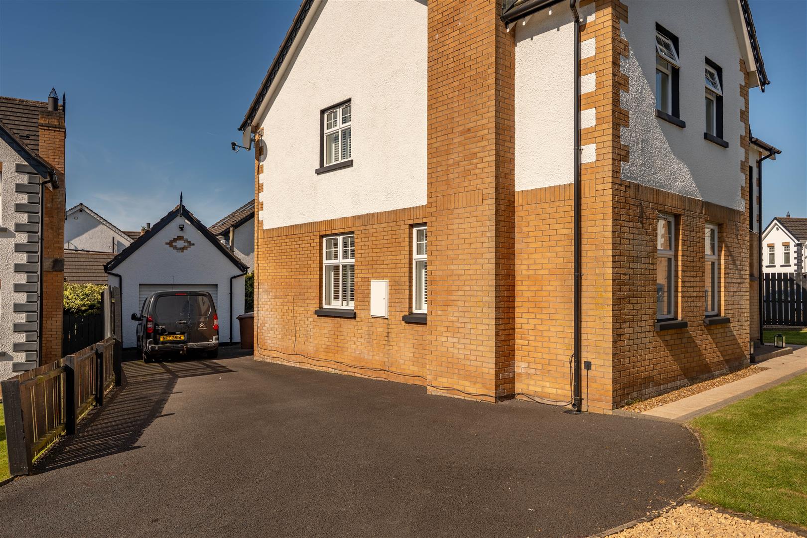 Tarmac drive to side with space for 3 cars. Neat lawn. Paved pathway leading to front door. Outside lighting.
