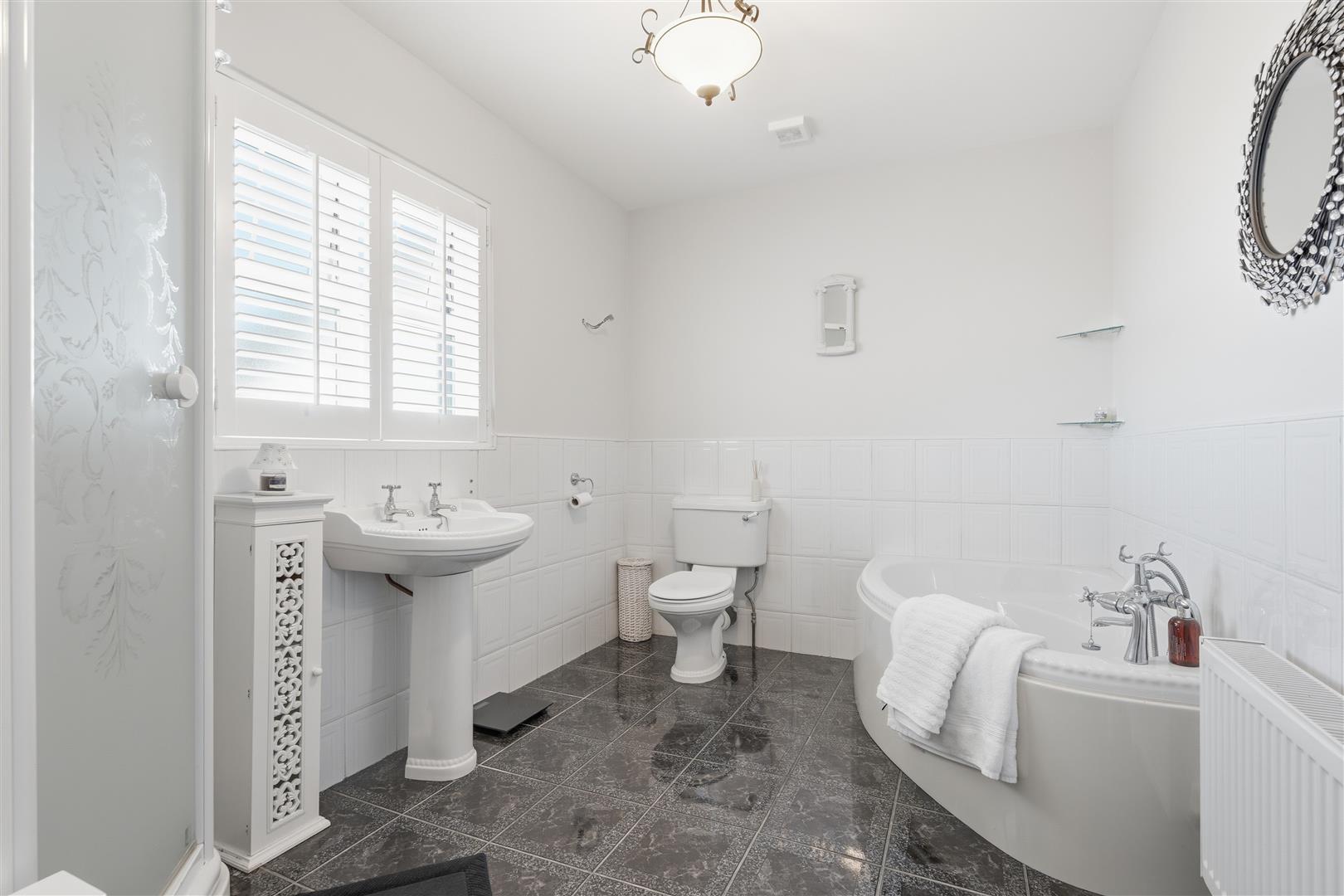Generous four piece white bathroom suite comprising a corner panel bath with feature 'Victorian' style chrome mixer tap and telephone shower attachment. Pedestal wash hand basin with chrome 'Victorian' style hot and cold taps. Low flush WC. Enclosed corner shower featuring a power shower with 'Rainfall' shower head, secondary attachment, fully tiled splashback and decorative glazed door. Fully tiled flooring and contrasting partially tiled walls. Extractor fan. Double radiator.
