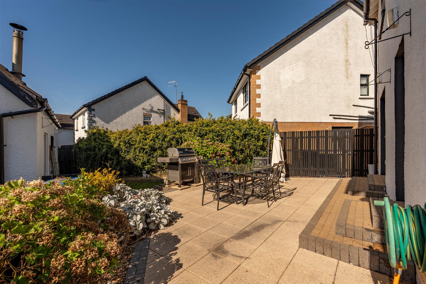 Fully enclosed rear garden offering exceptional privacy on sun orientation. Large paved patio with steps down to neat lawn. Outside tap and outside lighting. Timber pedestrian gate to driveway and opposite side. Mixed stone bedding. With specimen shrubbery.