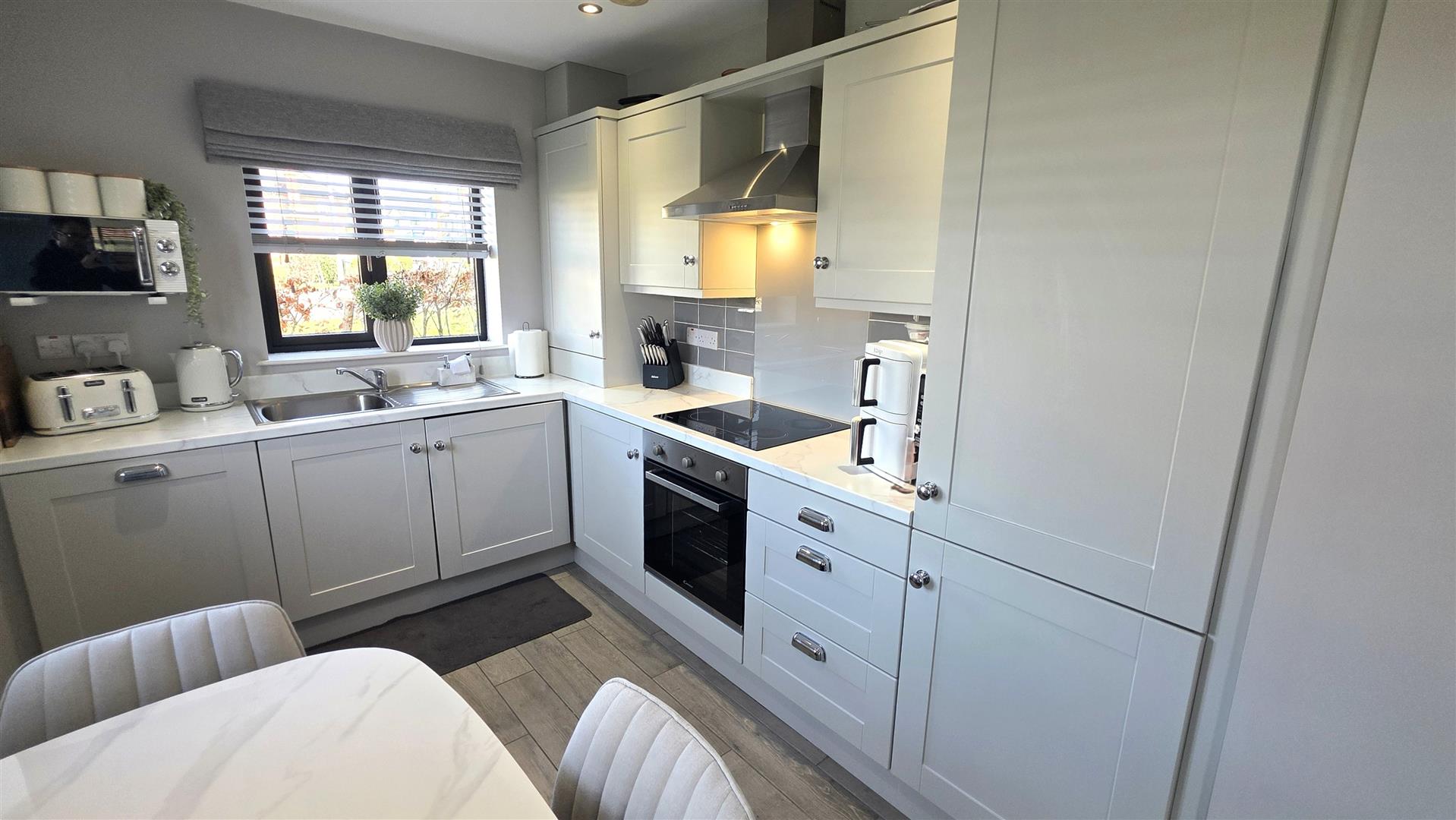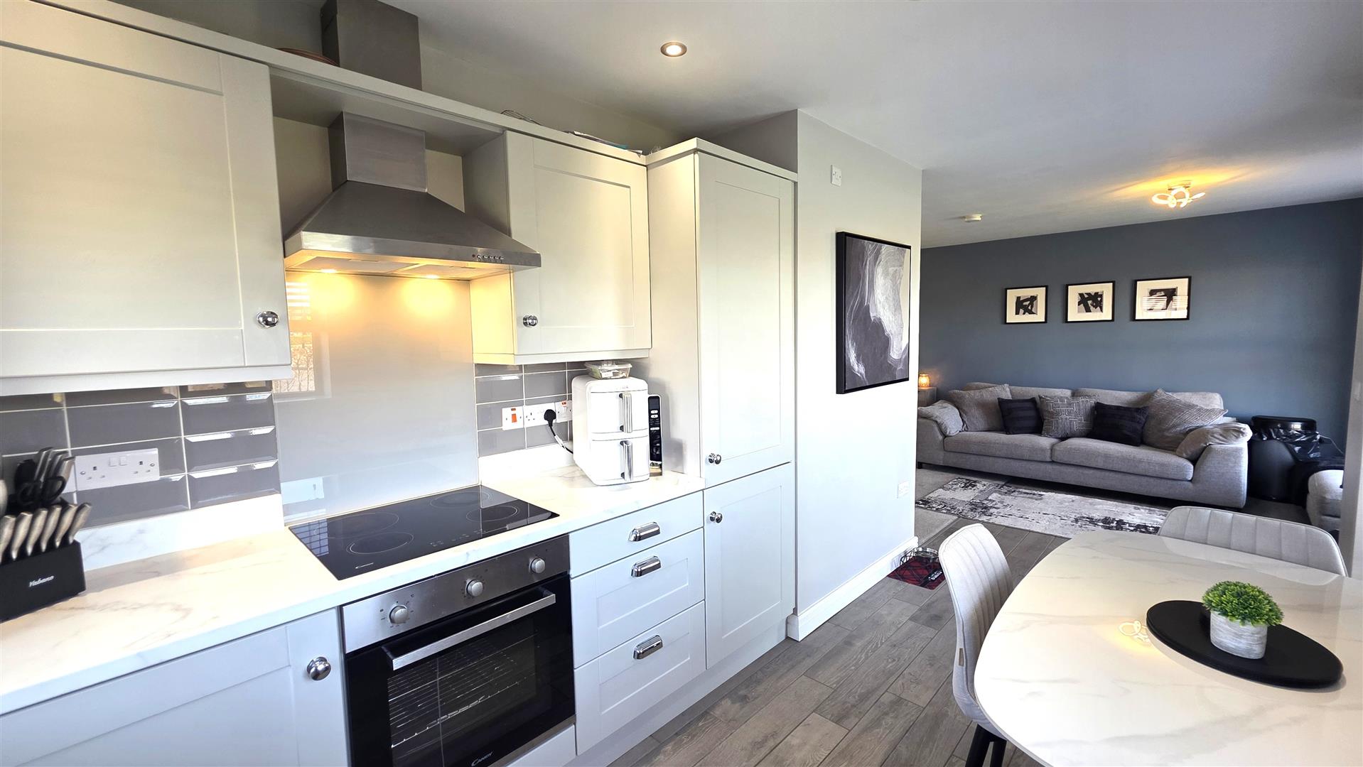 (at max) Full range of light grey "Shaker" style high and low level kitchen units with complimentary work tops and partial splash back tiling. Single drainer stainless steel sink unit with chrome mixer tap. Integrated appliances to include four ting halogen hob with glass splash back and stainless steel pyramid style over head extractor fan. Low level combination oven/grill, fridge freezer, dish washer and washer/dryer. Fully tiled floor to kitchen dining. Two double radiators. Double glazed PVC door to communal.
