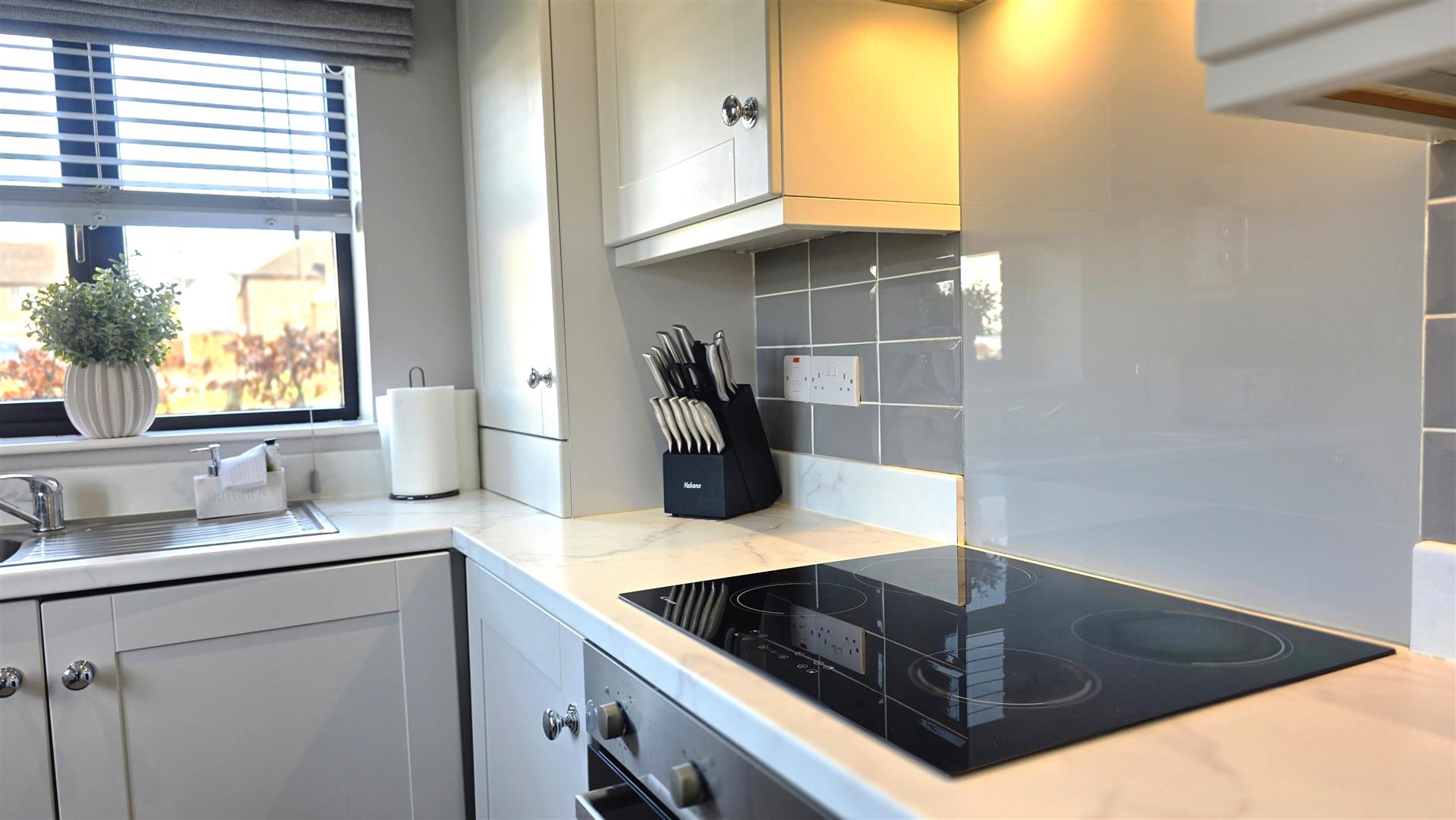 Full range of light grey high and low level kitchen units with complimentary work surfaces and splashback tiling