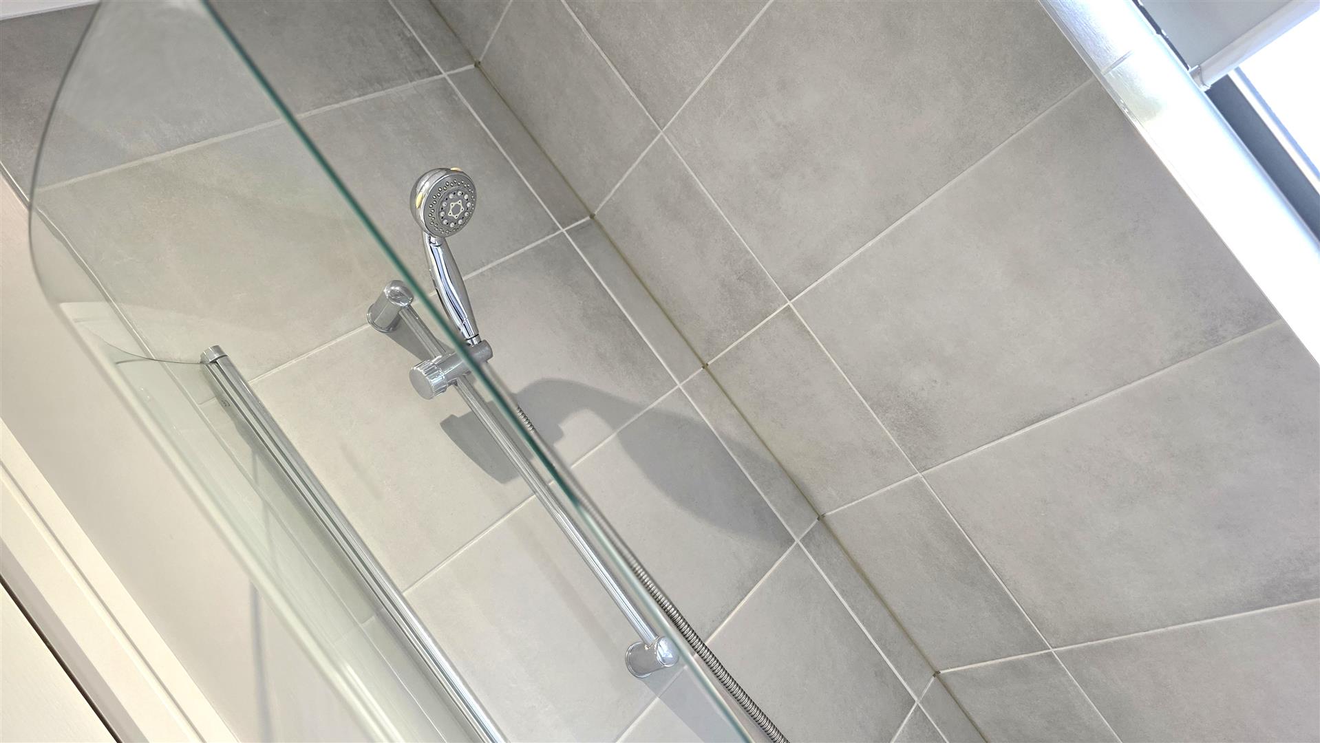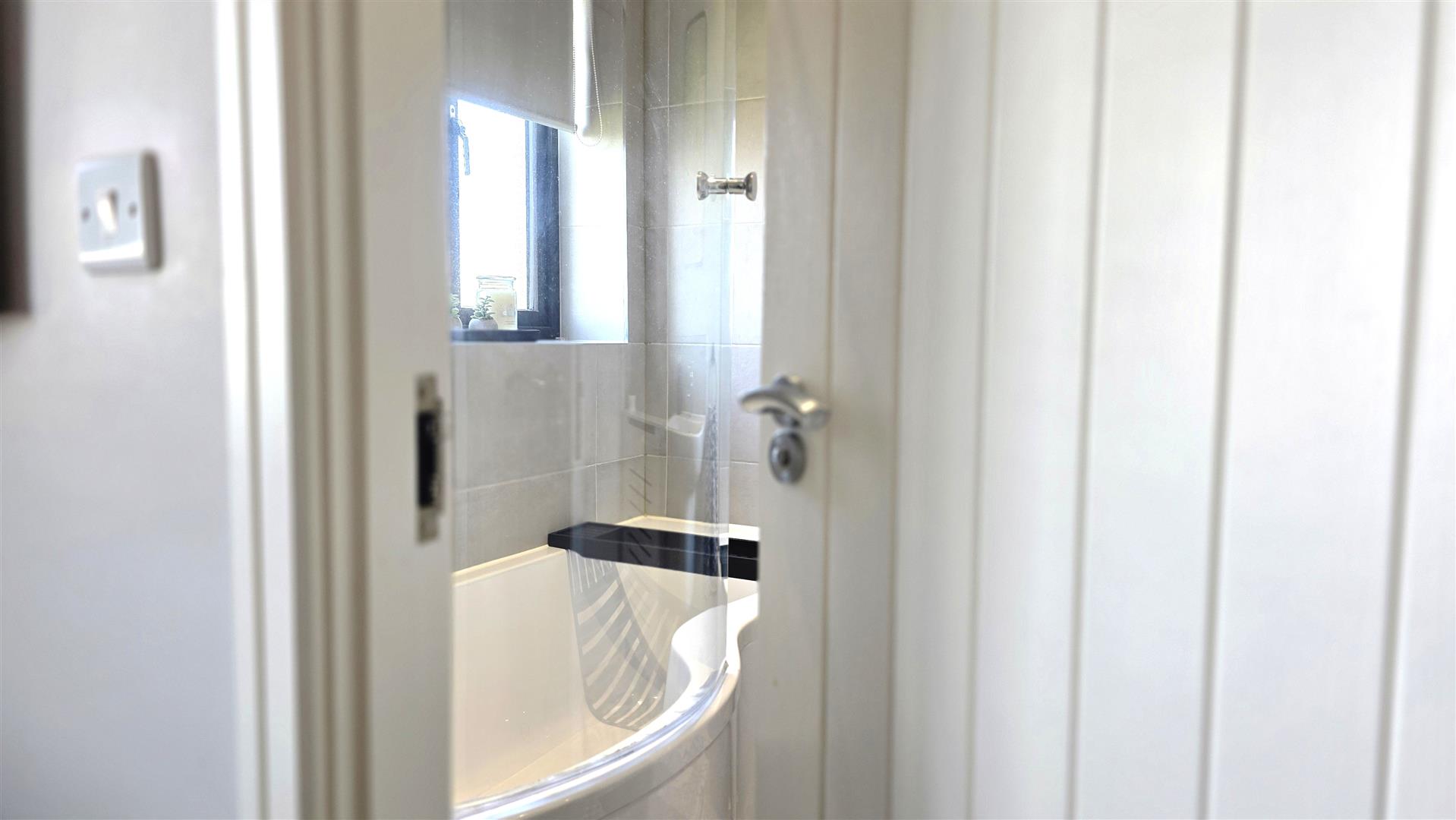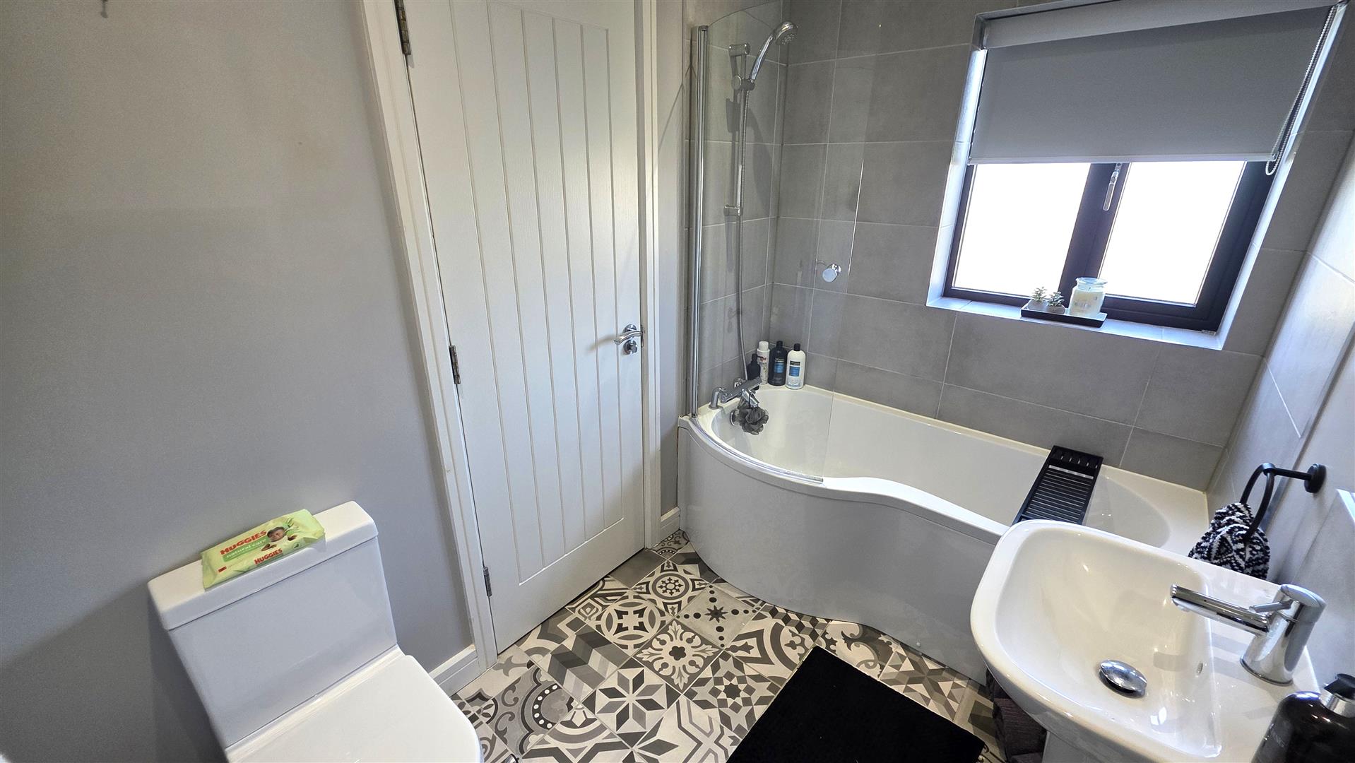 Modern white suite comprising a "P" shaped panel bath with chrome mixer tap, shower over with partially glazed screen and fully tiled splash back. Half pedestal wash hand basin with "monobloc" chrome mixer tap and tiled splash back. Low flush push button WC. Low voltage down lights. Fully tiled floor. Extractor fan. Single radiator.