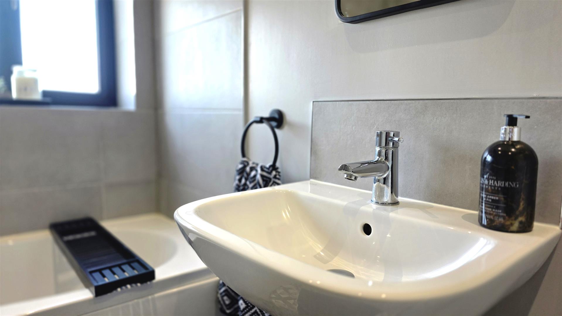 'Jack & Jill' bathroom with modern white suite to include 'P' shaped panel bath with shower over