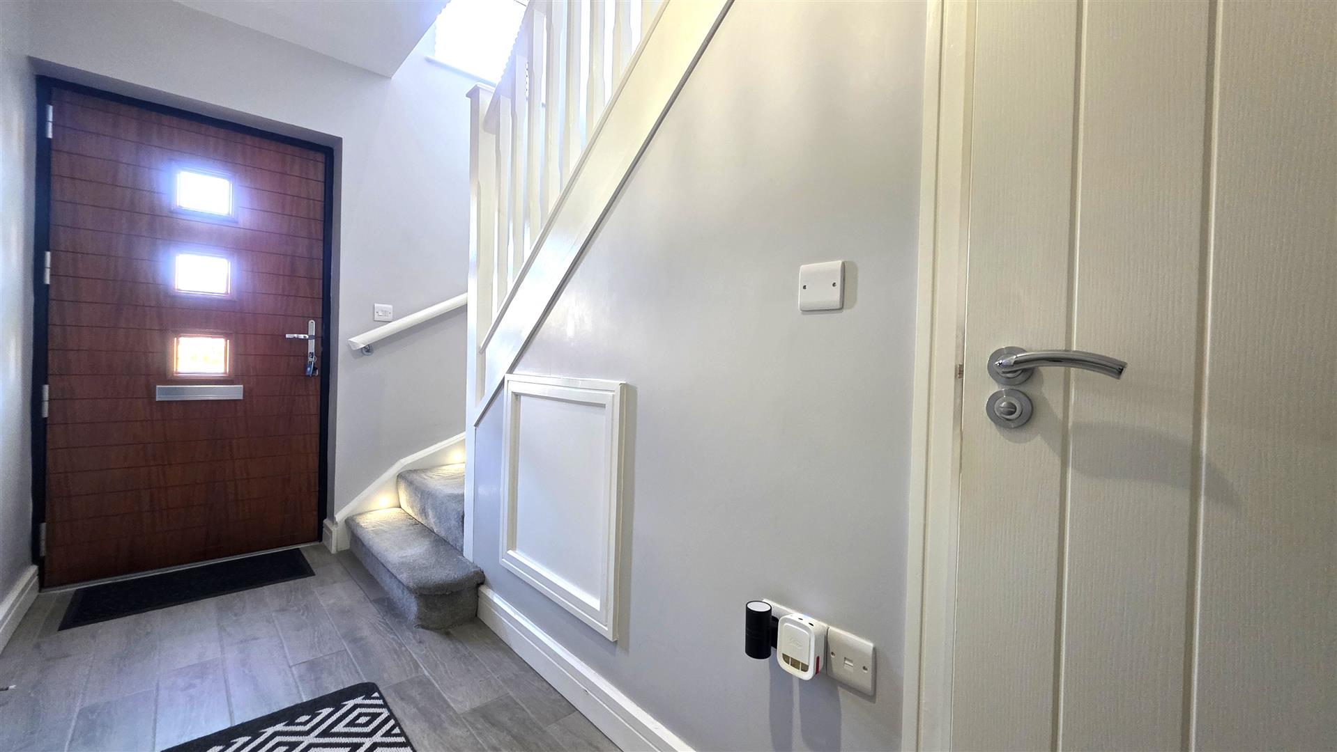 Hard wood three panel double glazed door to entrance with fully tiled floor. Stair case to first floor with turned ballusrading and hand rail. Single radiator. Cloak cupboard.