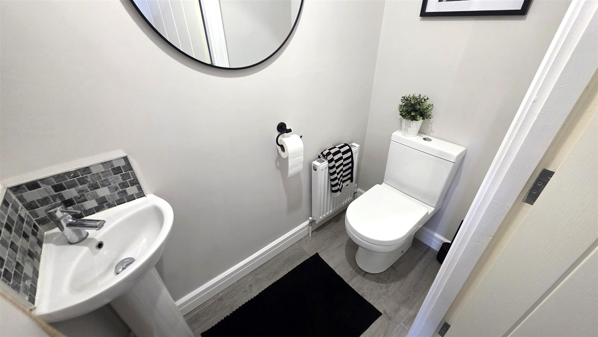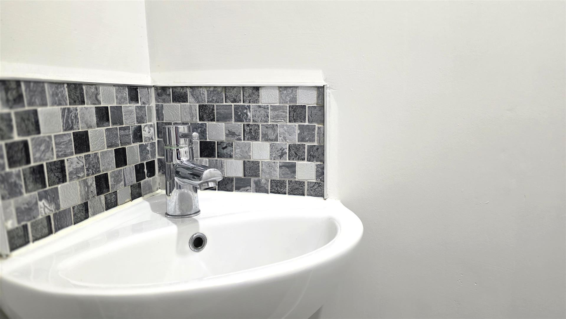 Modern white suite comprising a pedestal wash hand basin with "monobloc" chrome mixer tap and tiled splash back. Low flush push button WC. Single radaitor.