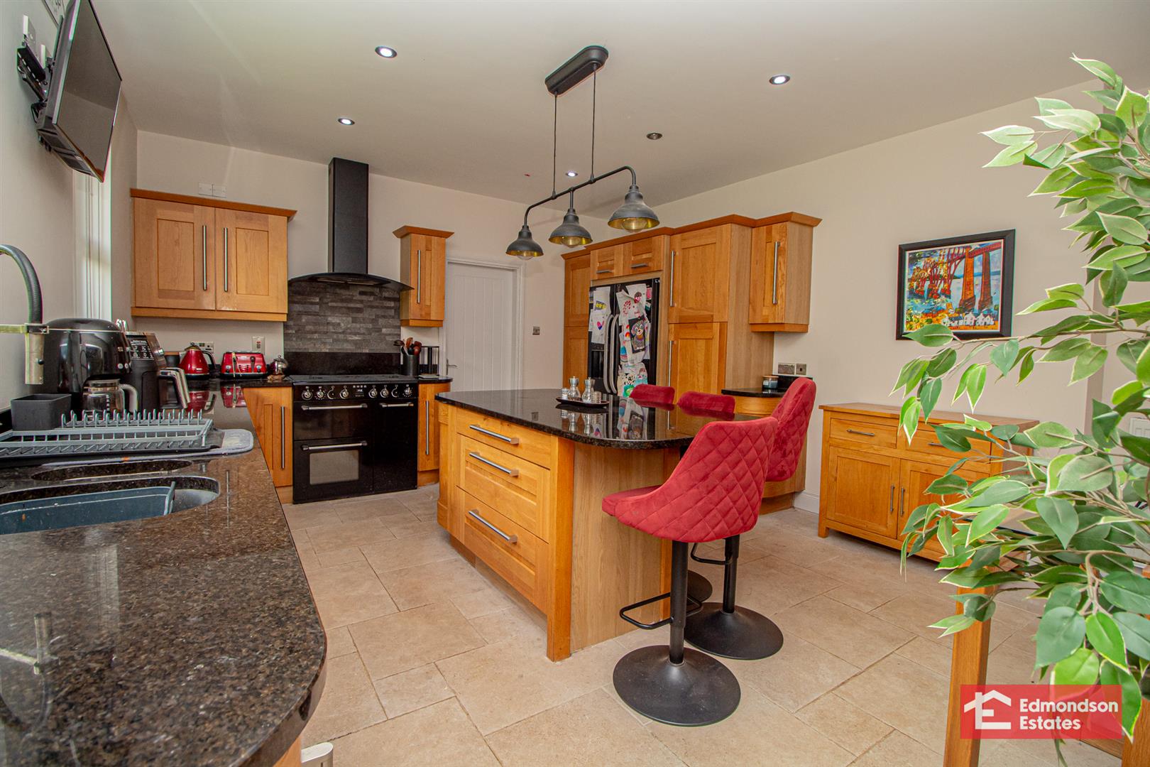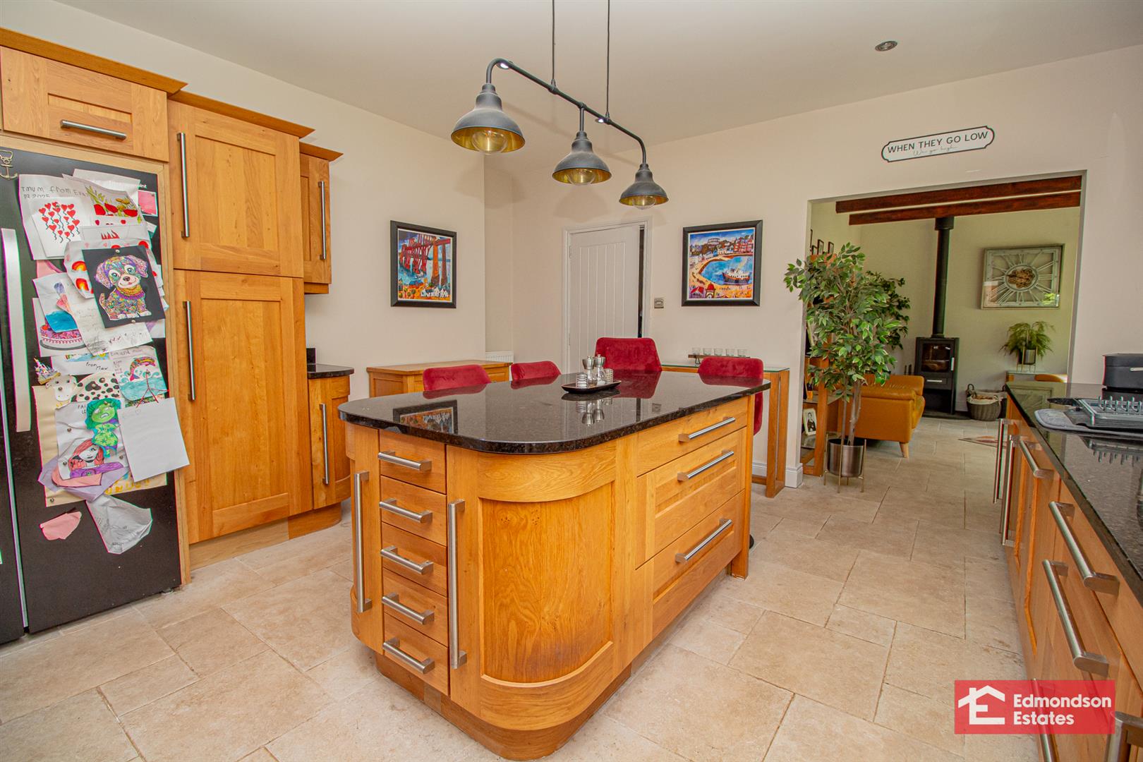 Oak high and low level units with granite worktop. Central island with dining overhang. Space for range cooker. Space for American style fridge/freezer. Integrated dishwasher. Tiled flooring and splash backs.