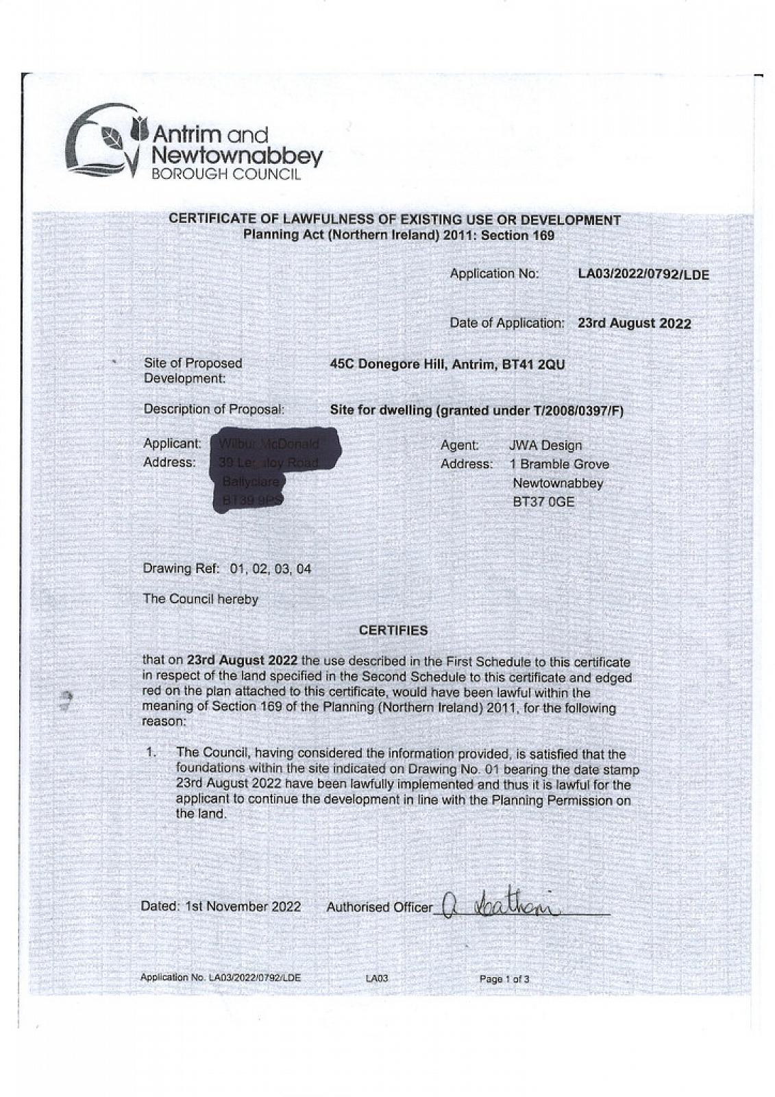 An excellent opportunity to acquire a superb building site with full planning permission for a substantial detached residence extending to approximately 3,680 sq ft. Situated on Donegor Hill, this elevated site offers the perfect setting to create a bespoke family home in a highly accessible and desirable location. The approved plans provide for a spacious and contemporary property, with generous accommodation designed to meet the needs of modern family living. The site is ideally positioned just 9 miles from Belfast International Airport and 5 miles from Templepatrick, offering convenience for commuters and frequent travellers alike. The surrounding area is renowned for its attractive rural landscape, while still benefiting from close proximity to local amenities, schools, and transport links. Rarely do opportunities arise to build such an impressive home in this sought-after location.