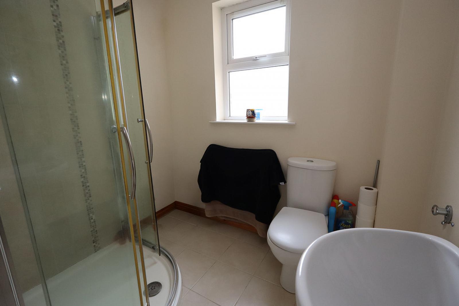 BATHROOM 3 Piece suite comprising half pedestal wash hand basin, push button W/C, tiled shower enclosed with thermostatically controlled shower unit, ceramic tiled flooring, downlighters, extractor fan,