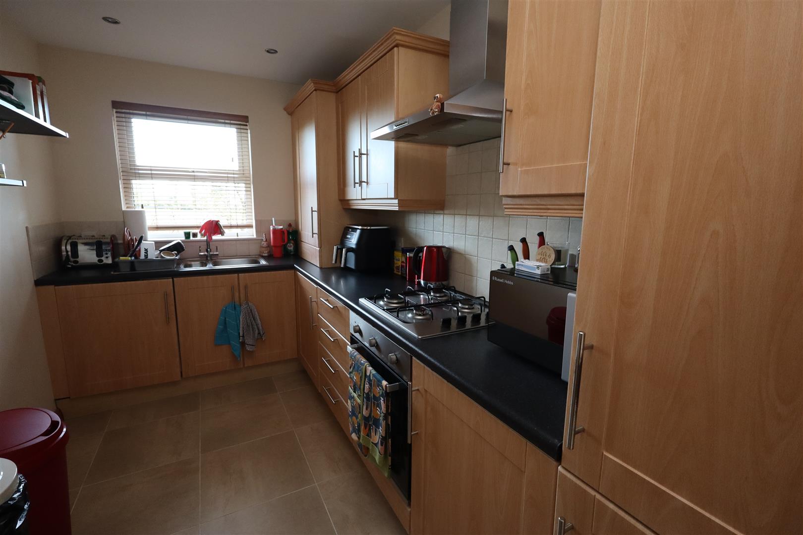 Ceramic tiled flooring, part wall tiling, range of high and low level units with contrasting round edge work surfaces, built in fan assisted oven, built in gas hob, stainless steel overhead extractor canopy, 1& 1/2 bowl stainless steel sink unit with mixer tap and drainer, gas boiler, built in fridge freezer, downlighters