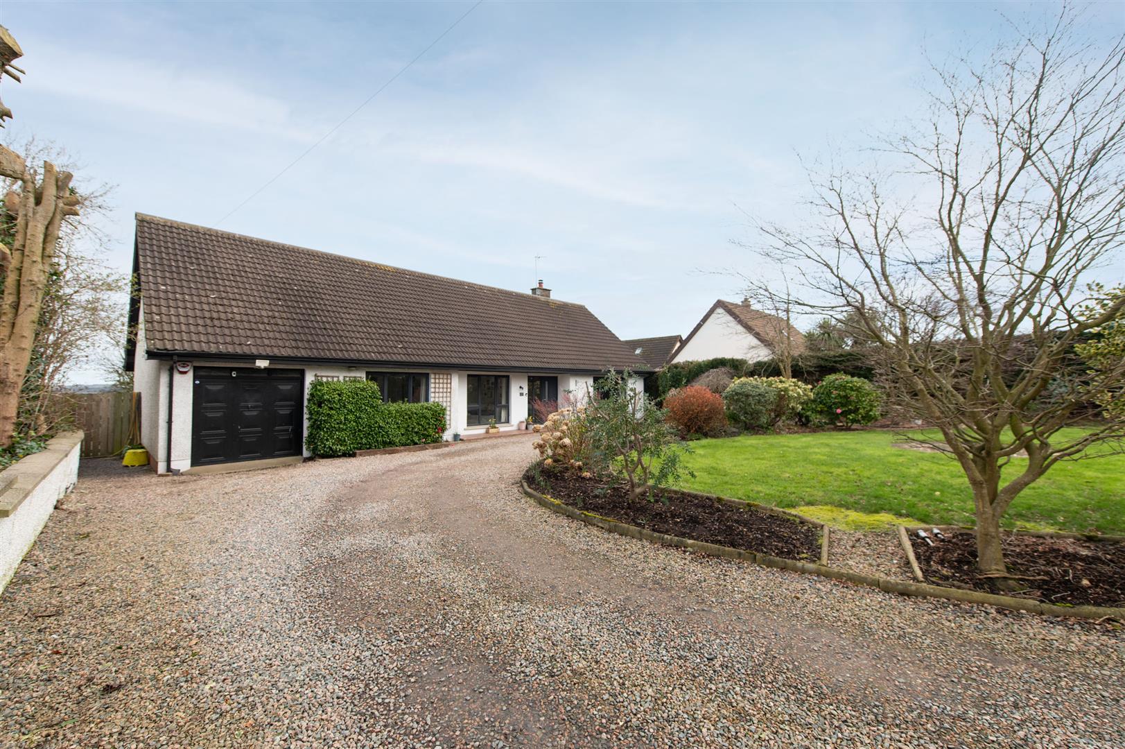 This charming detached bungalow is set in a desirable semi-rural location, enjoying a delightful outlook over open fields to the rear. Inside, the home offers three comfortable bedrooms, two complete with built-in robes for convenient storage. A generous lounge creates a welcoming space to unwind, while the contemporary shaker-style kitchen is thoughtfully designed and opens into a bright, open-plan casual dining area-perfect for family life and entertaining guests. The stylish bathroom features a deluxe suite with a separate shower enclosure. Further advantages include double glazing in uPVC frames and oil-fired central heating, ensuring warmth and efficiency. The attached garage has been partially subdivided to provide a useful utility area, and the enclosed rear garden offers both privacy and a beautiful rural backdrop.