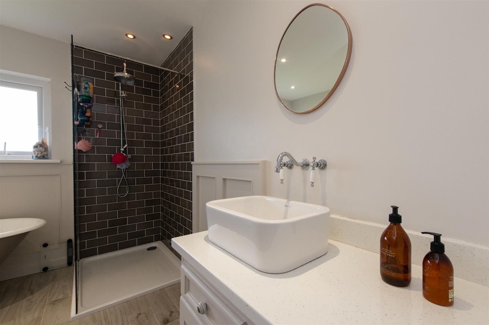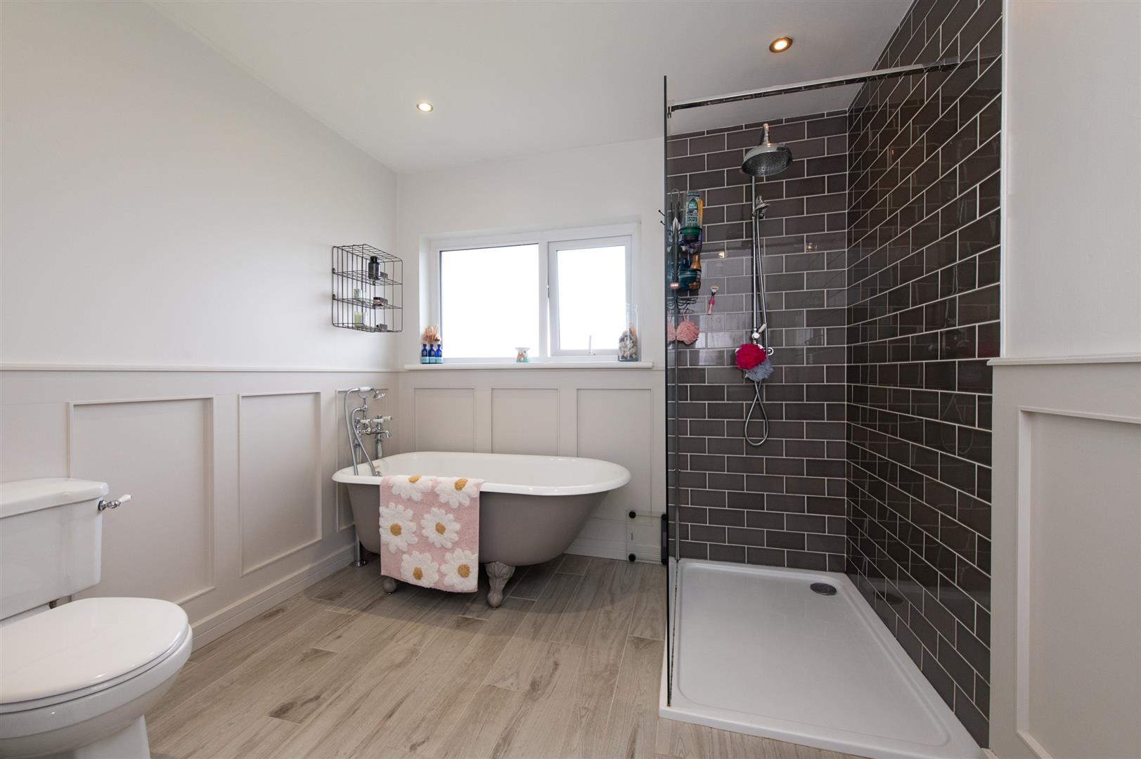 Modern white suite comprising freestanding bath, separate glazed walk in shower area with feature rainfall shower and separate handheld shower, low flush W/C, vanity unit sink, wall panelling, wall tiling, downlighters, feature radiator