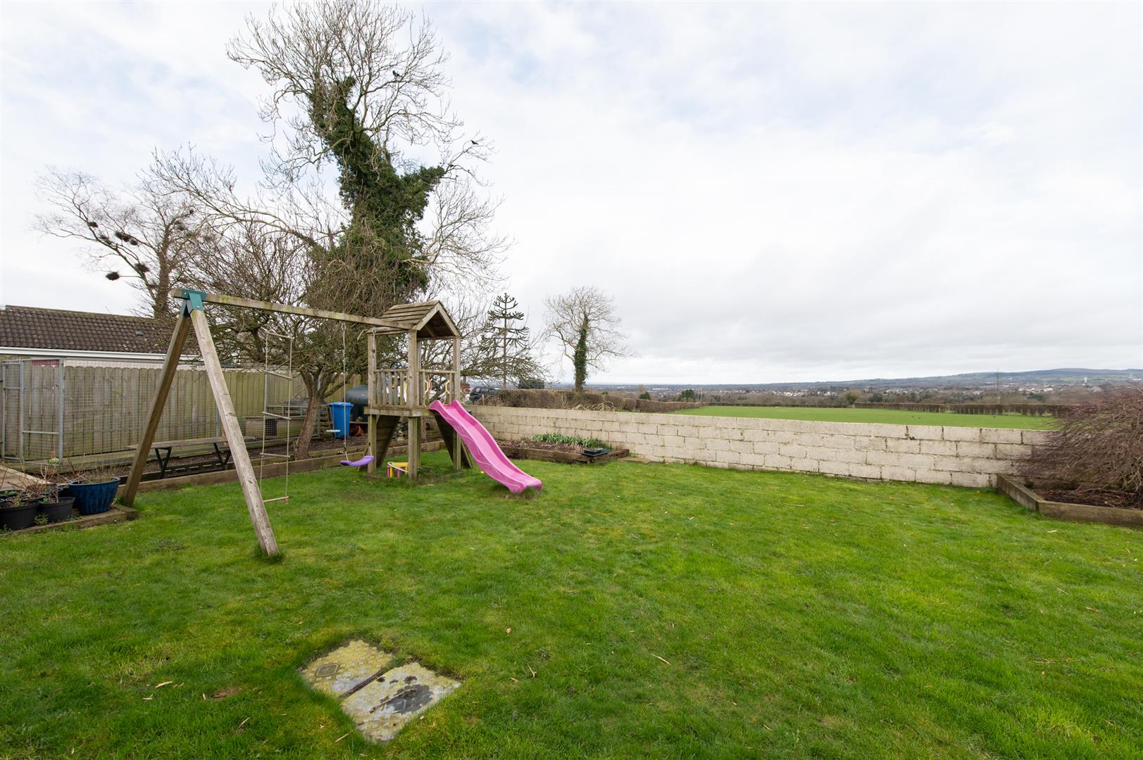 Rear garden in lawn boarding open fields, paved area, outside light and tap