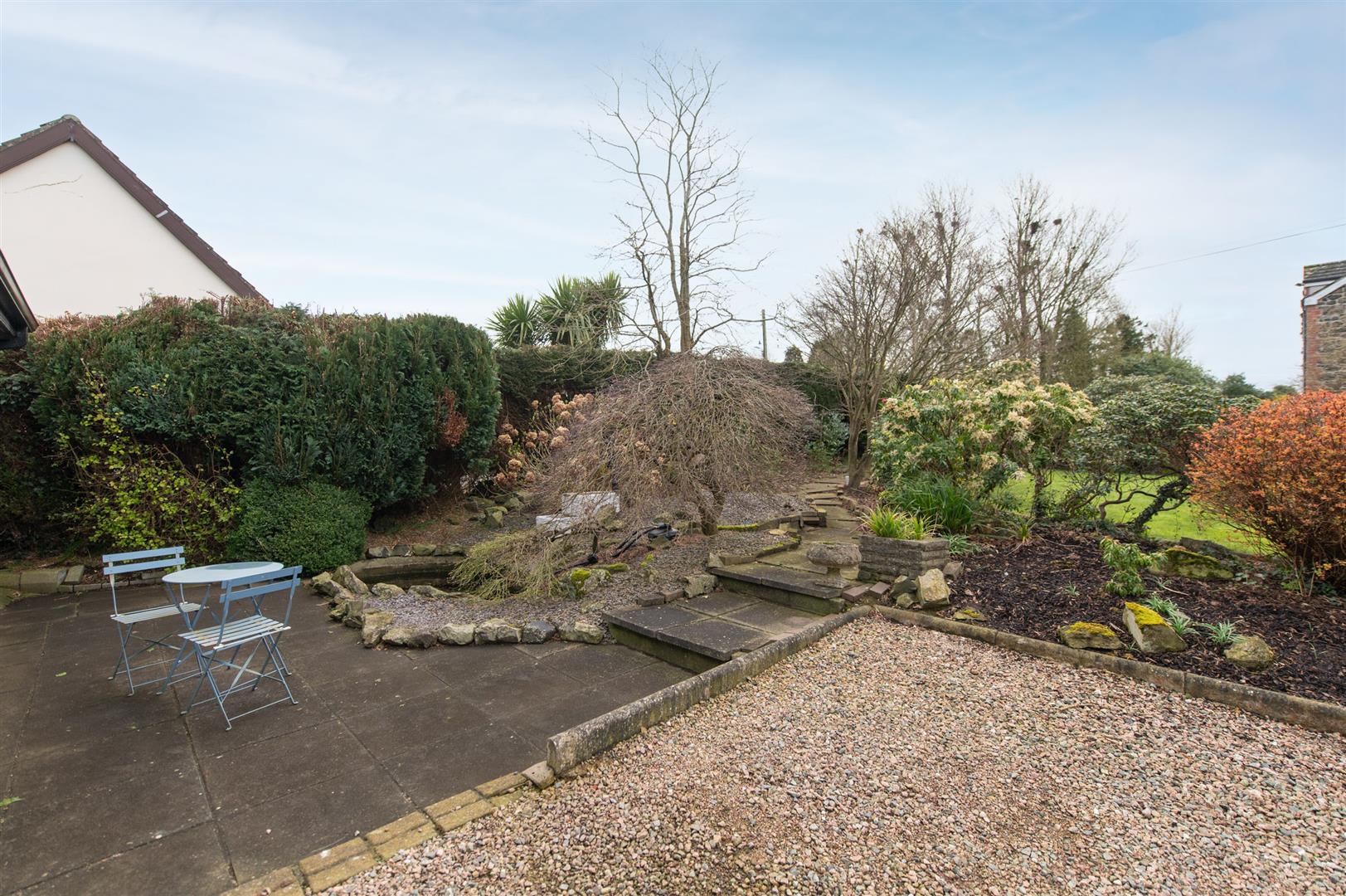 Garden to front, in lawn, driveway in stones, plants and shrubs,
