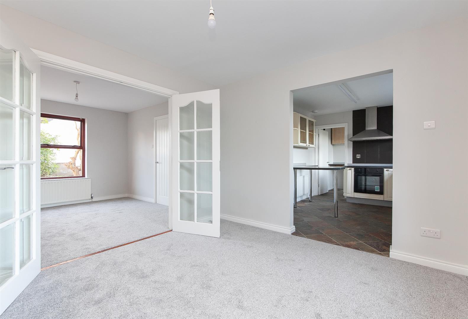 Open fire in cast iron fireplace with tiled inset and slate hearth. Glass panelled French doors leading to: