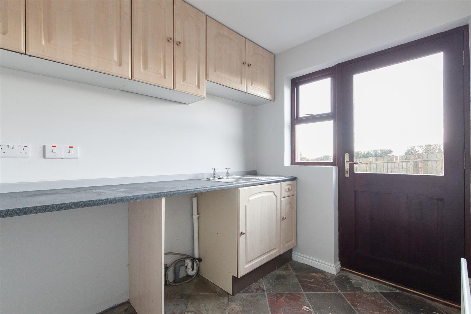 Range of fitted high and low level storage units with contrasting granite effect melamine work surface. Stainless steel sink unit with draining bay. Plumbed and space for washing machine. Space for undercounter appliances. Upstand to wall. Chinese slate floor. Hardwood double glazed door leading to rear garden.