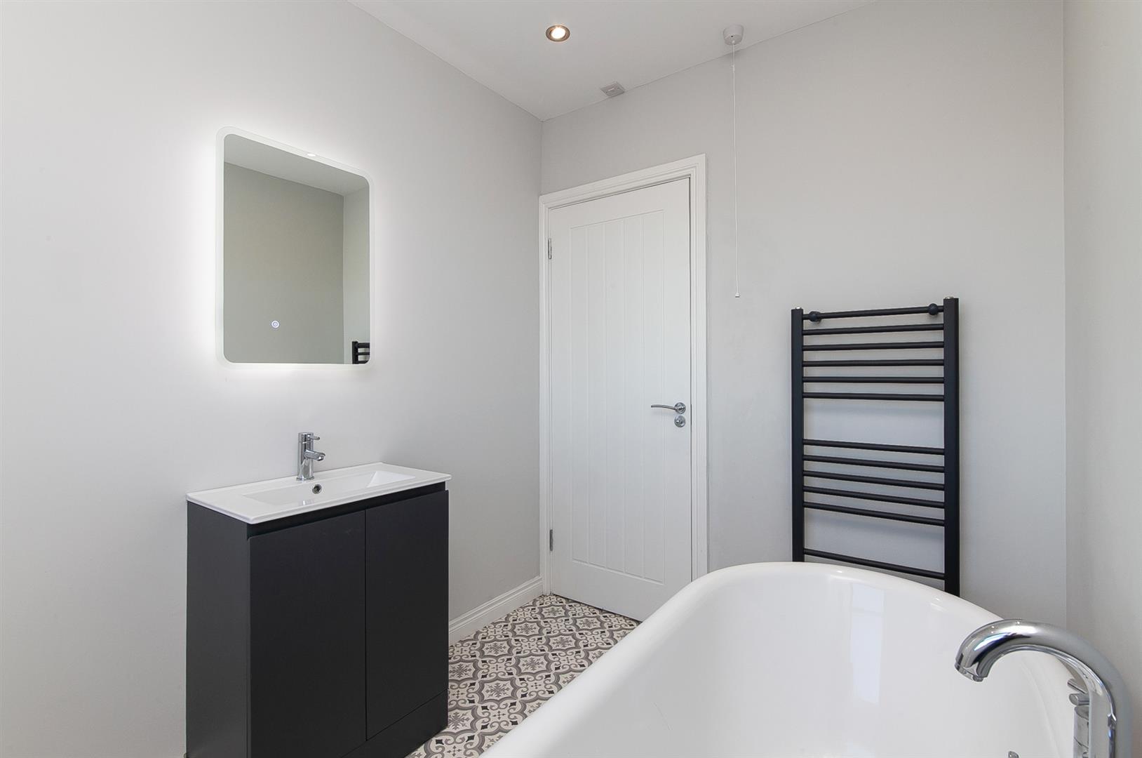 Contemporary white three piece suite comprising freestanding bath, vanity unit and WC. Towel radiator. Illuminated mirror over sink.