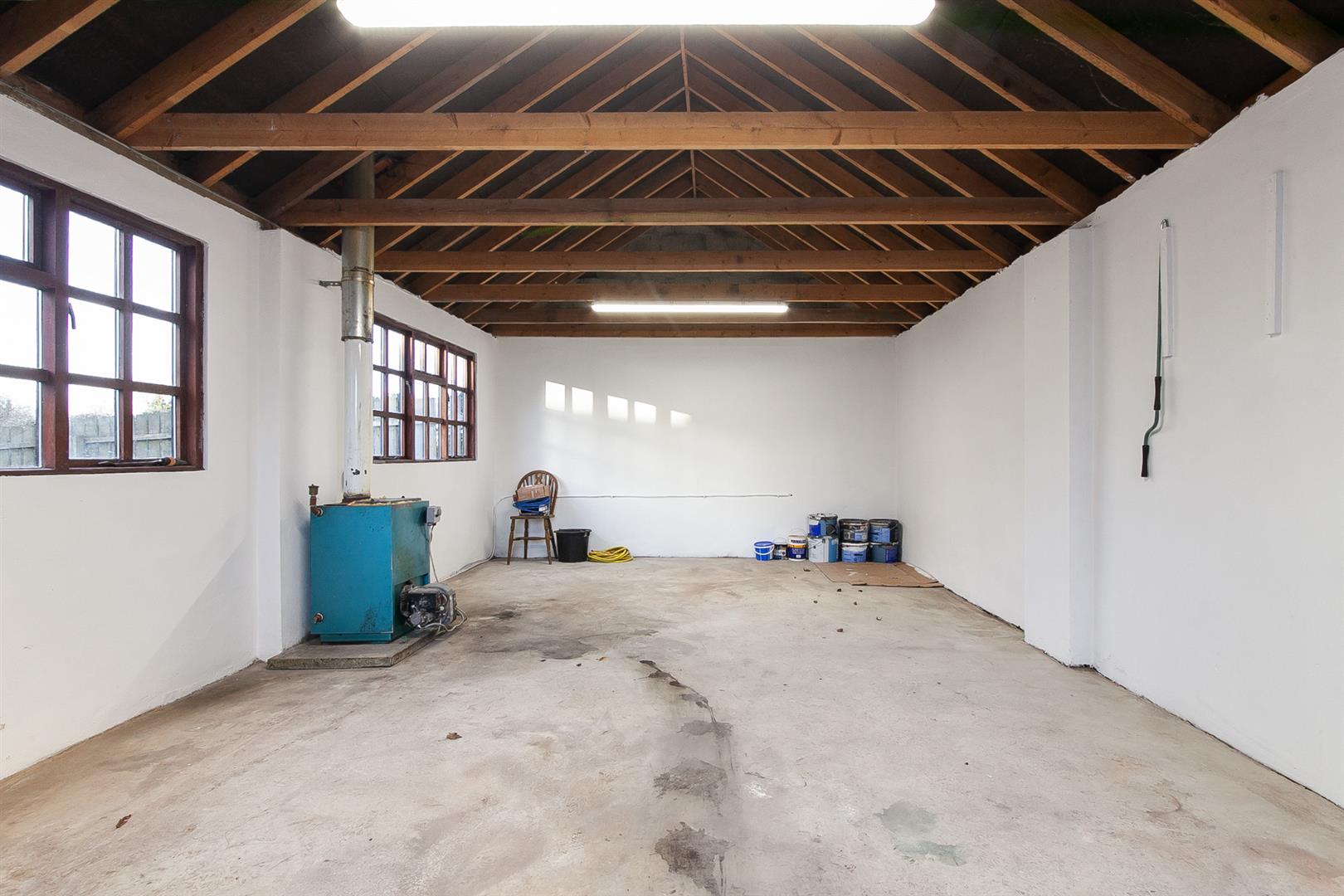 Power operated roller shutter door. Separate service door. Power, light and oil fired central heating boiler.