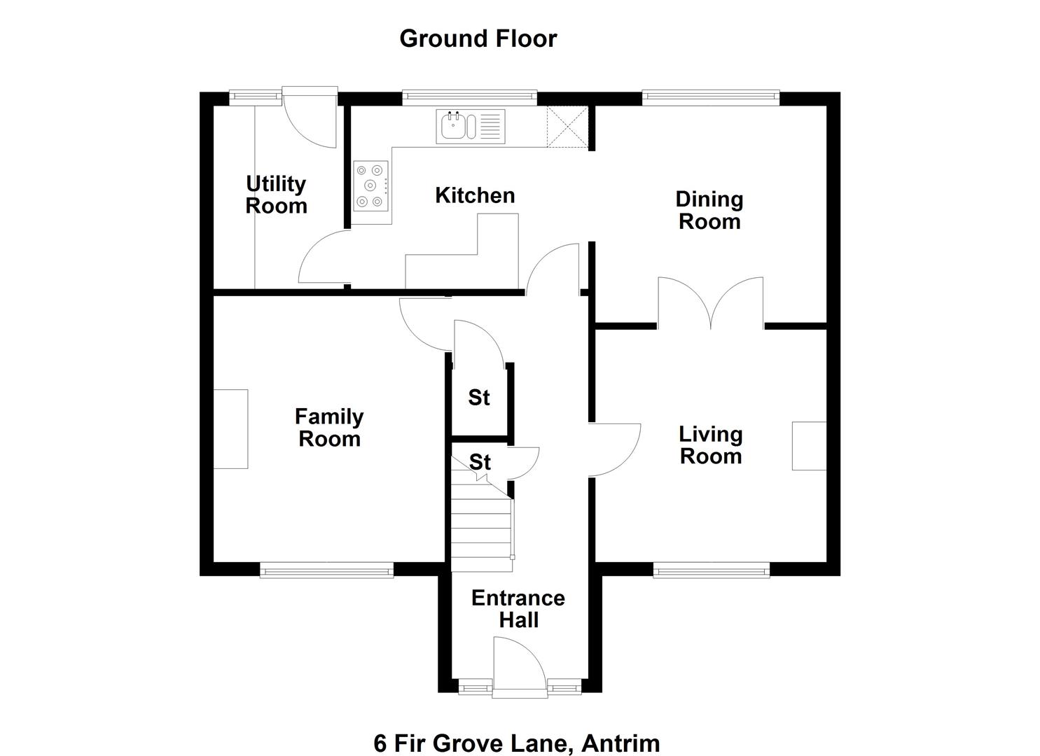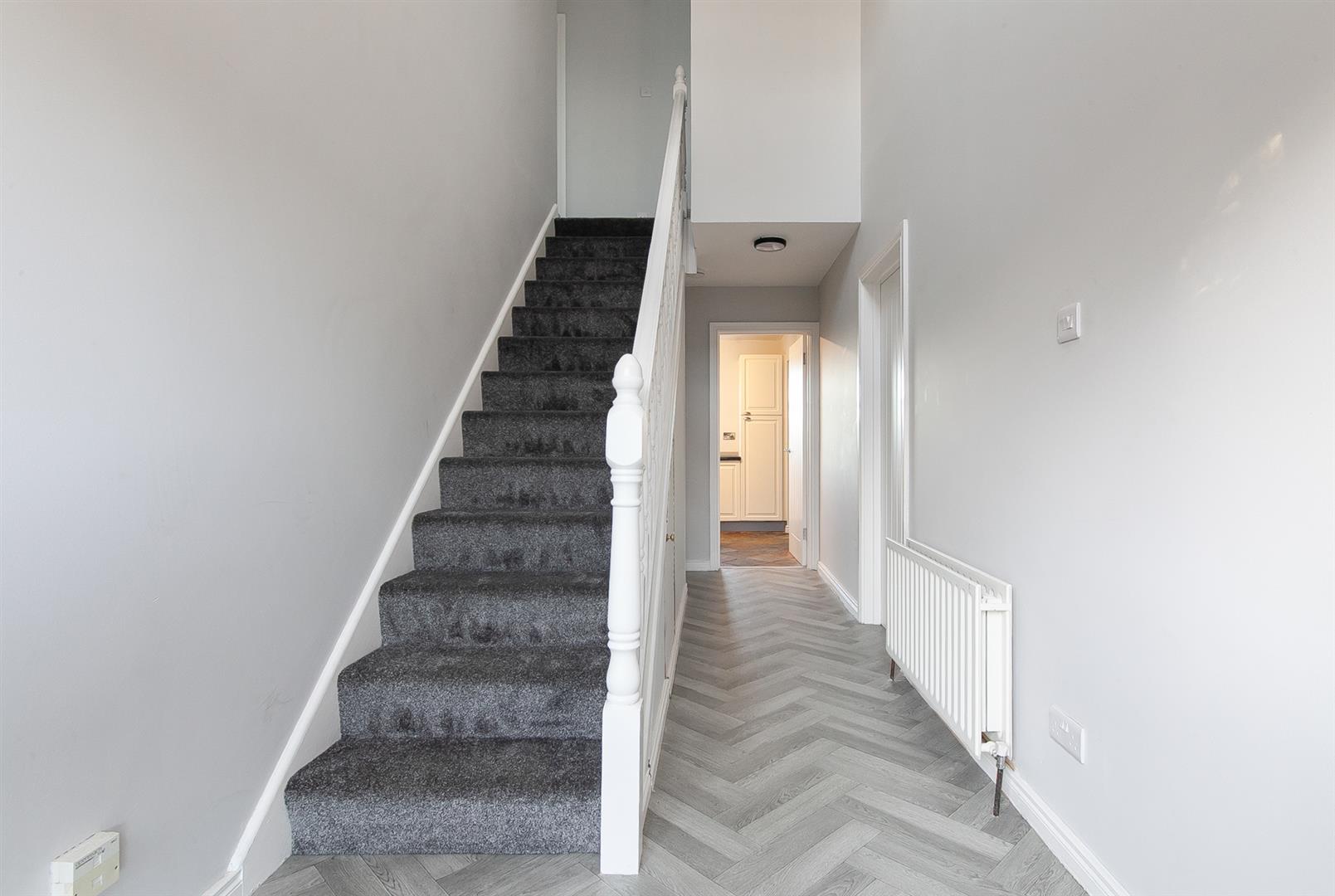 Hardwood double glazed front door with matching side screens. Feature height ceiling. Stairwell to first floor. Access to under stairs store.