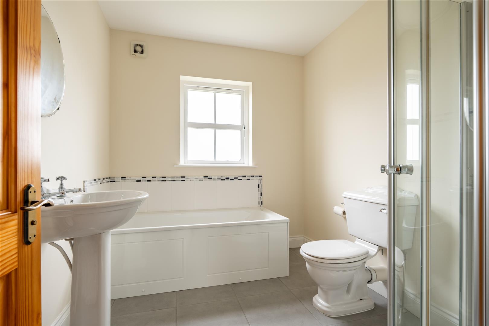 Modern white suite comprising panelled bath; separate tiled shower cubicle with thermostatically controlled shower unit and wall mounted telephone shower attachment; fitted shower doors; pedestal wash hand basin; low flush WC; part tiled walls; tiled floor; extractor fan.