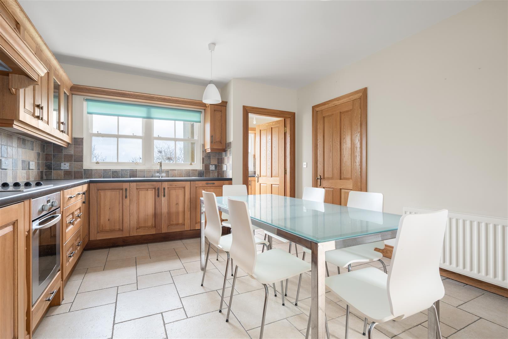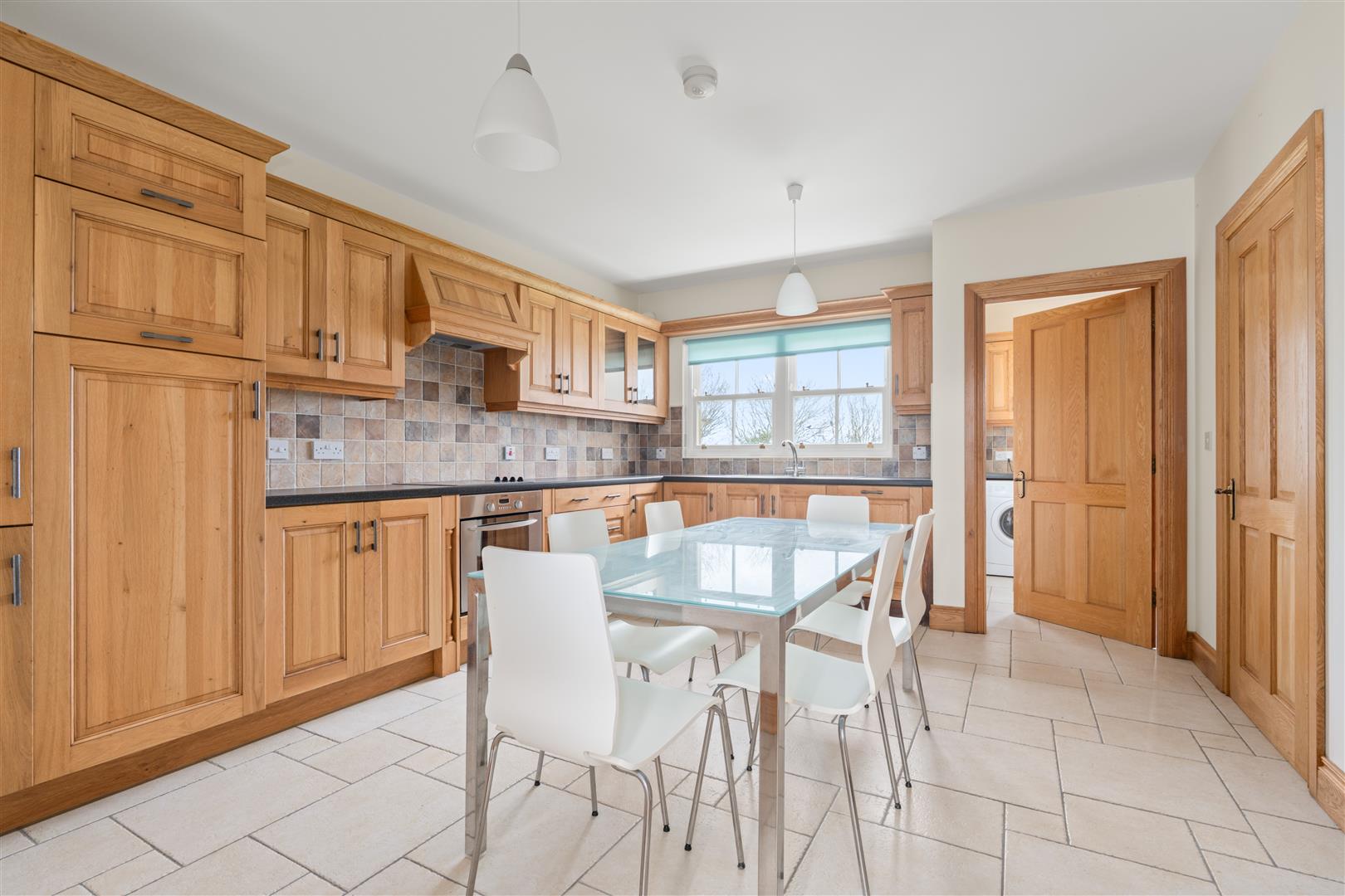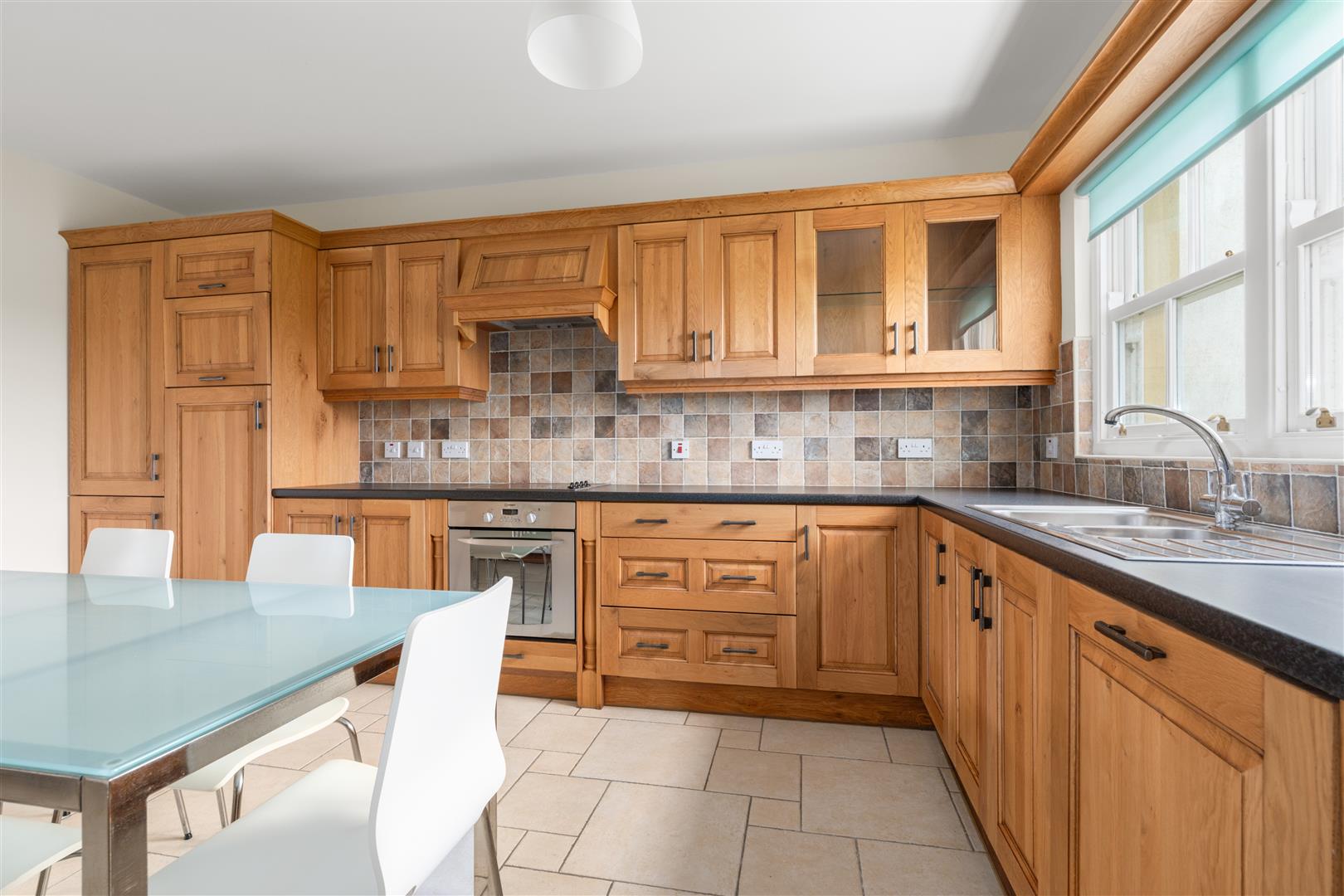 Excellent range of Oak high and low level cupboards and drawers with matching glazed display cupboards incorporating Blanco 1½ tub stainless steel sink unit with mixer taps; integrated Indesit Electric under oven with Indesit 4 ring ceramic hob; concealed extractor unit over; Tricity Bendix fridge / freezer; Indesit dishwasher; formica worktops; tiled splashback; tiled floor.
