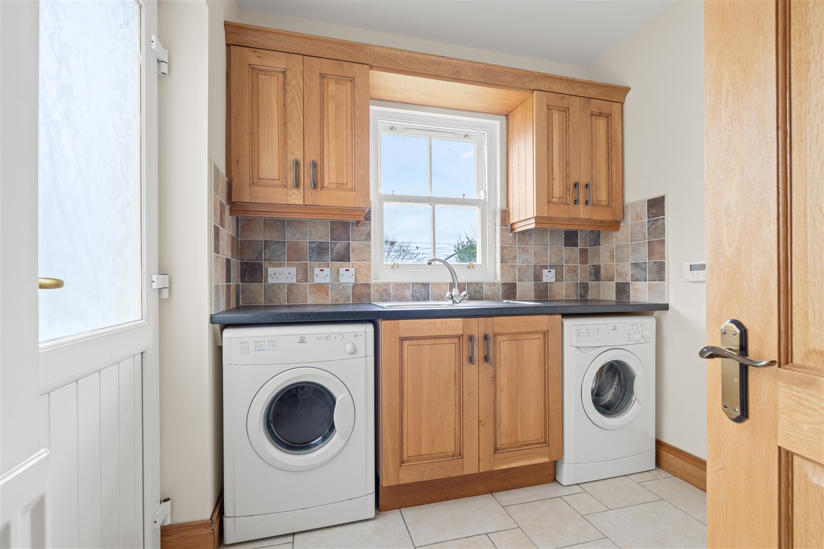 Compact range of Oak high and low level cupboards incorporating single drainer stainless steel sink unit with mixer taps; washing machine and tumble dryer; formica worktops; tiled splashback; tiled floor; glazed Upvc door to rear.