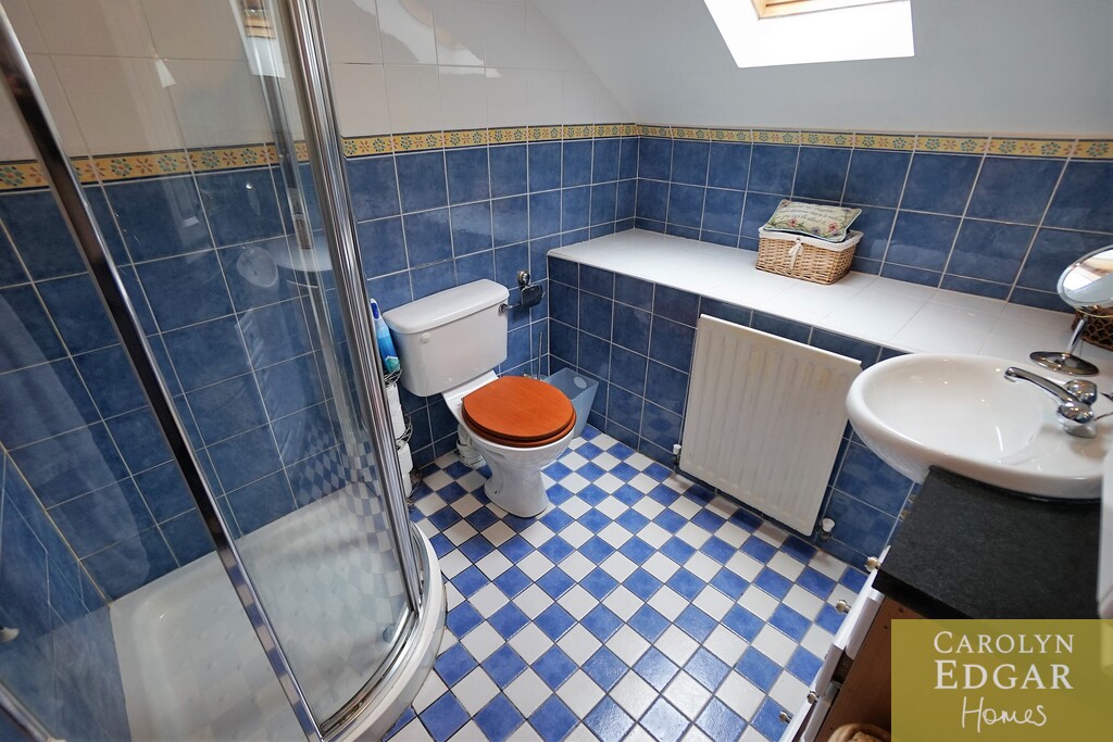 Modern bathroom suite comprising of low flush WC, vanity sink unit and large corner shower. Fully tiled. Velux window.