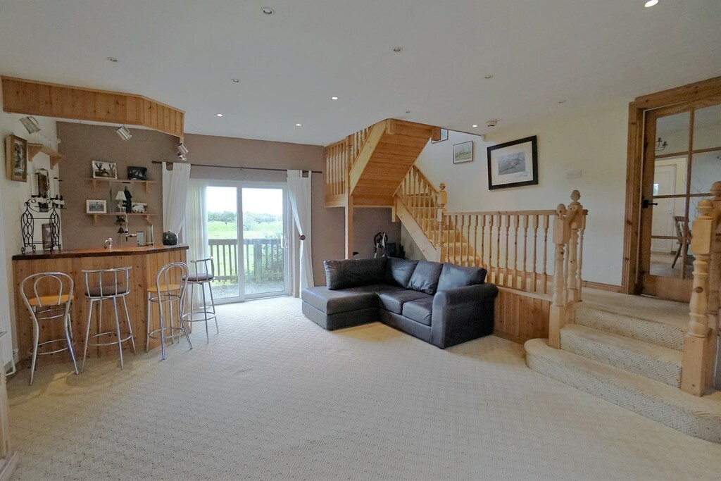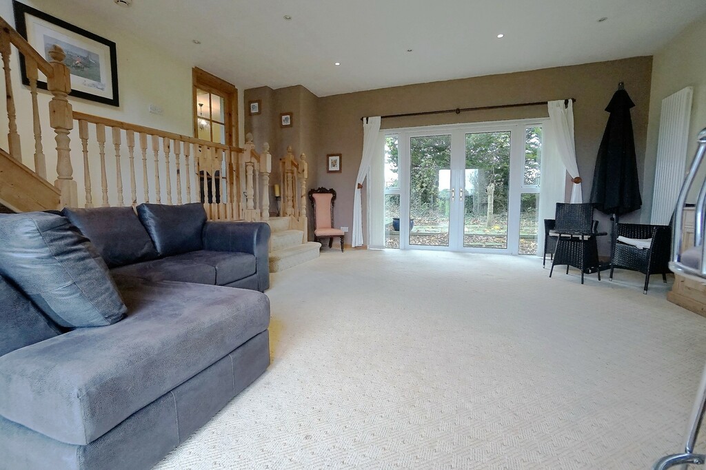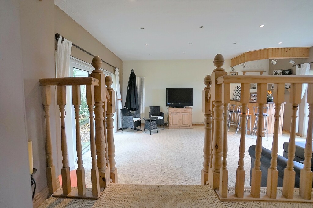 Fitted bar/entertainment area. Carpeted. French doors to decked terrace. Double doors to front garden.