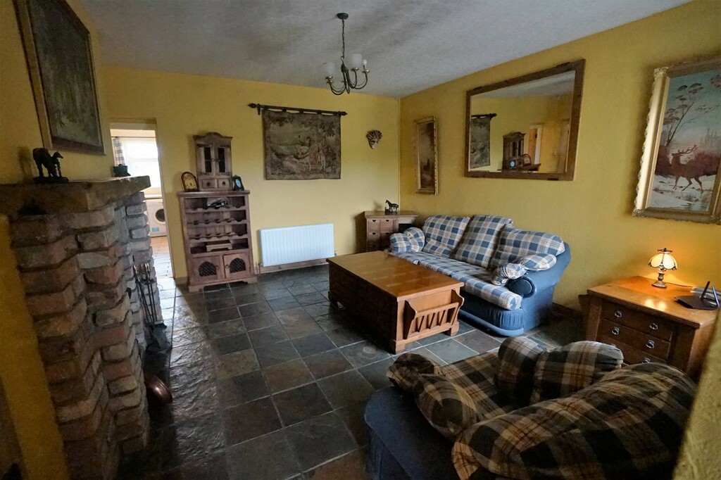 Feature brick inglenook fireplace with wood burning stove. Stone tiled floor.
