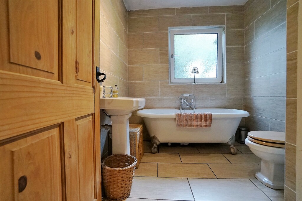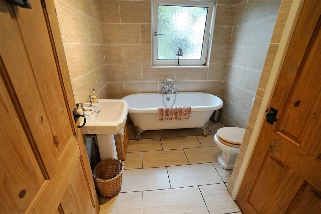 Modern bathroom suite compromising of pedestal wash hand basin, low flush WC and freestanding bath. Fully tiled floor and walls.