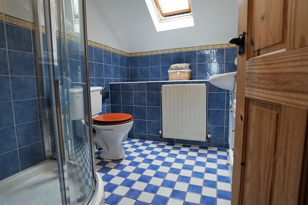 Modern bathroom suite comprising of low flush WC, vanity sink unit and large corner shower. Fully tiled. Velux window.