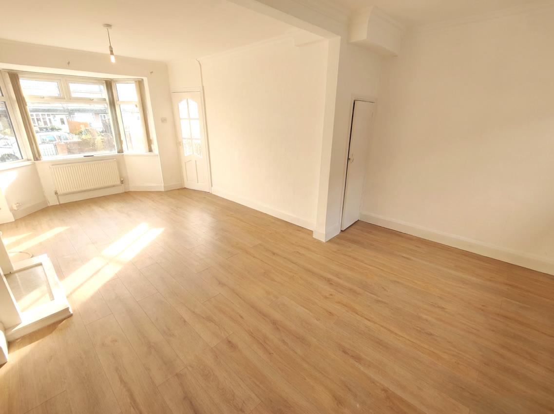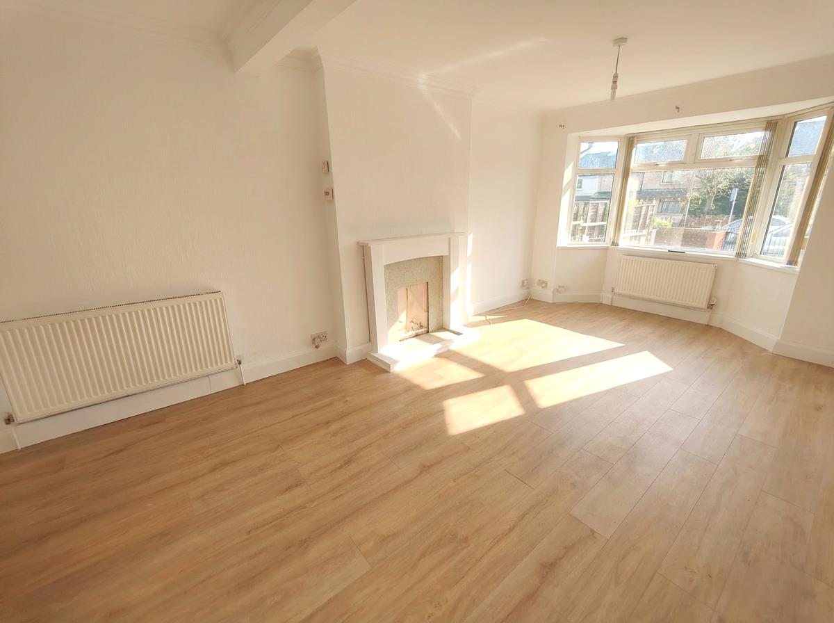 Into bay, wood laminate floor, hole in wall fireplace, under stairs storage, two double panelled radiator.