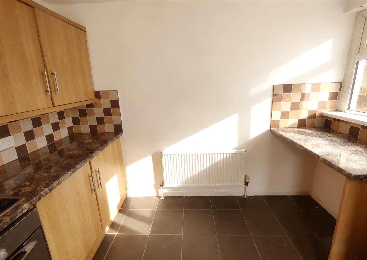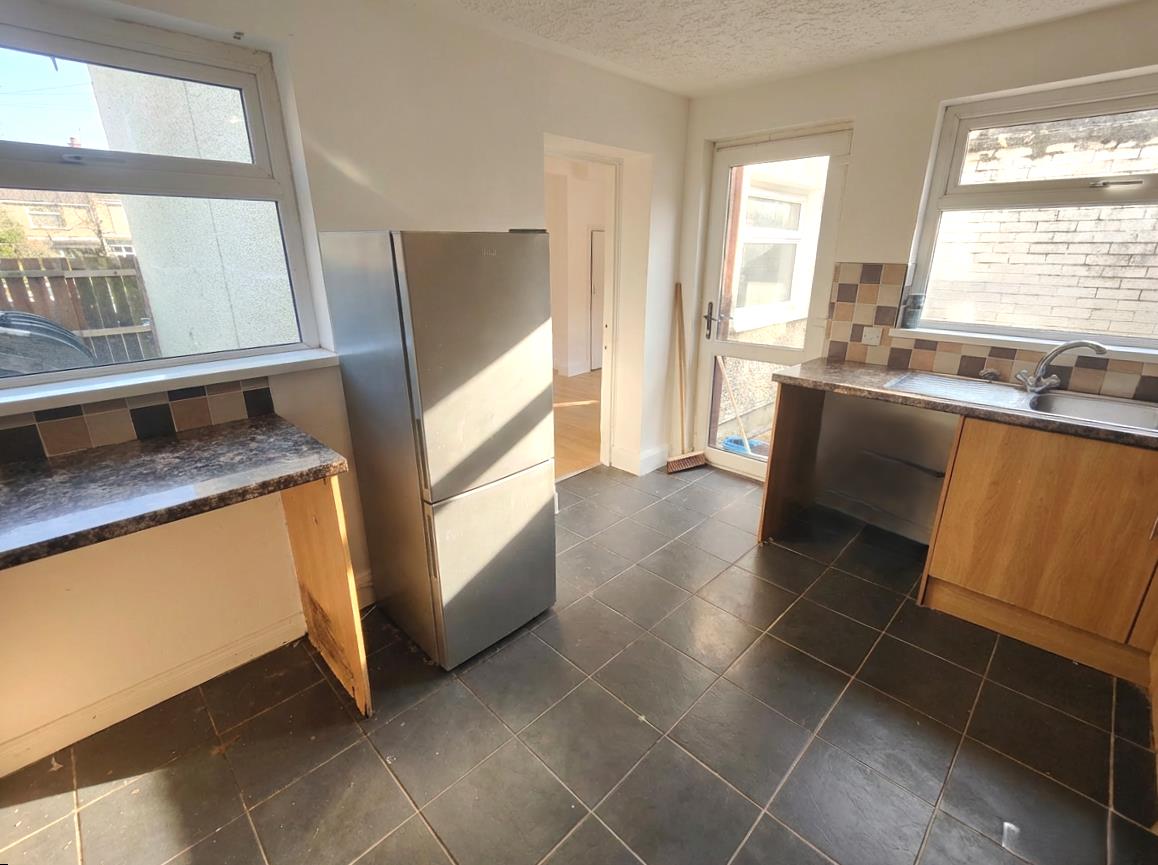 Single drainer stainless steel sink unit, extensive range of high and low level units, breakfast bar, formica worktops, built-in oven and hob, integrated extractor, fridge/freezer space, plumbed for washing machine, partially tiled walls, ceramic tiled floor, panelled radiator, pvc door to rear.