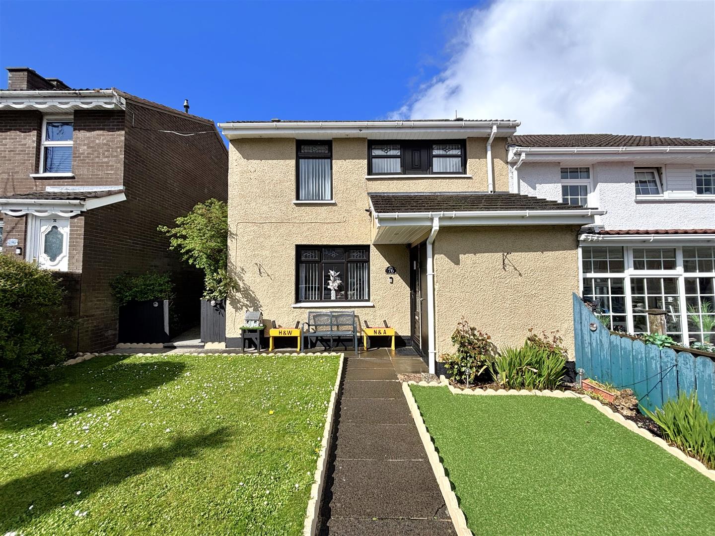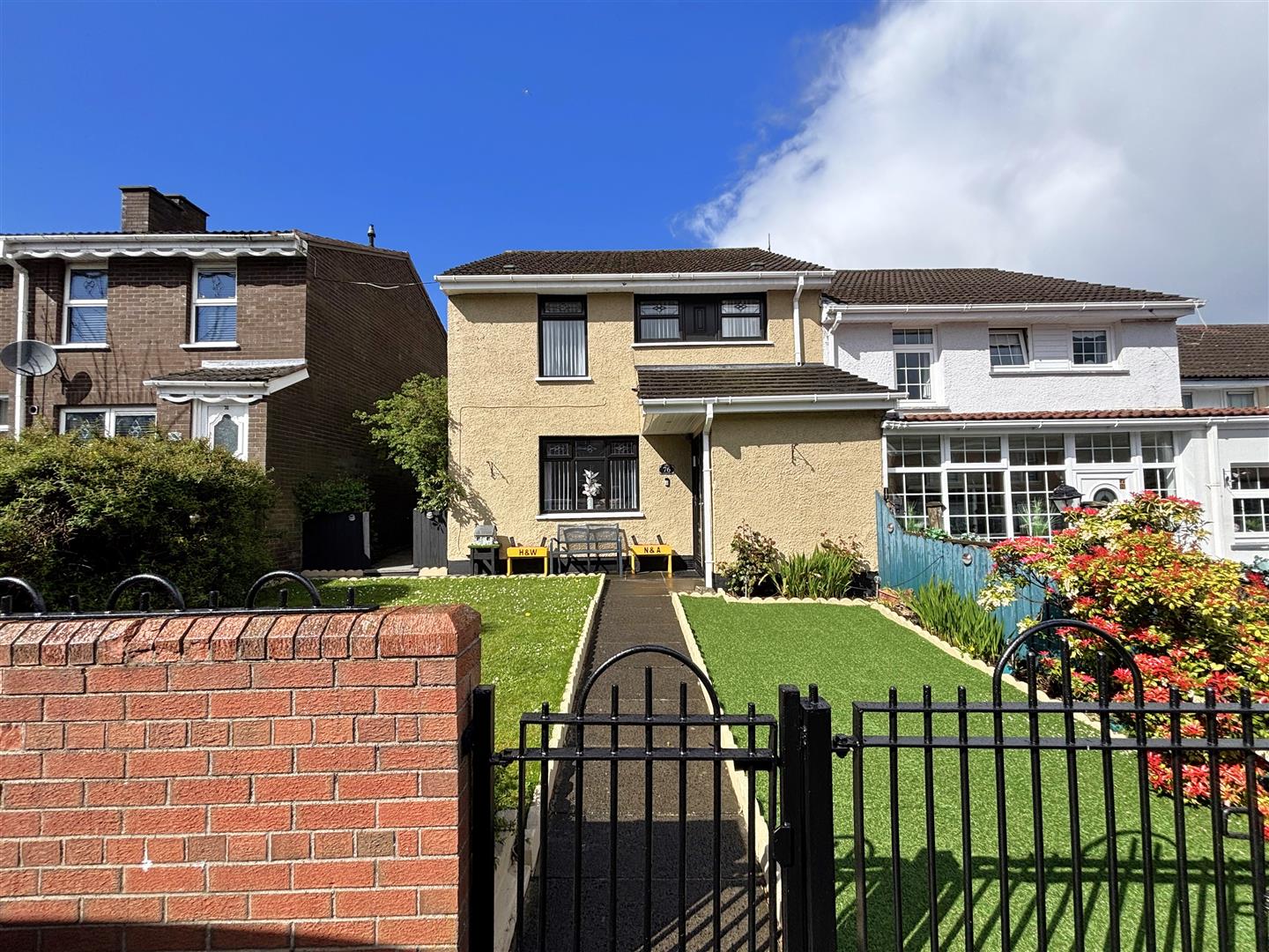 Driveway parking. Front garden in mature lawn, flower beds, artificial grass, storage. Rear garden in composite decking, artificial grass, flower beds, pvc oil tank, boiler house, outside light and tap.