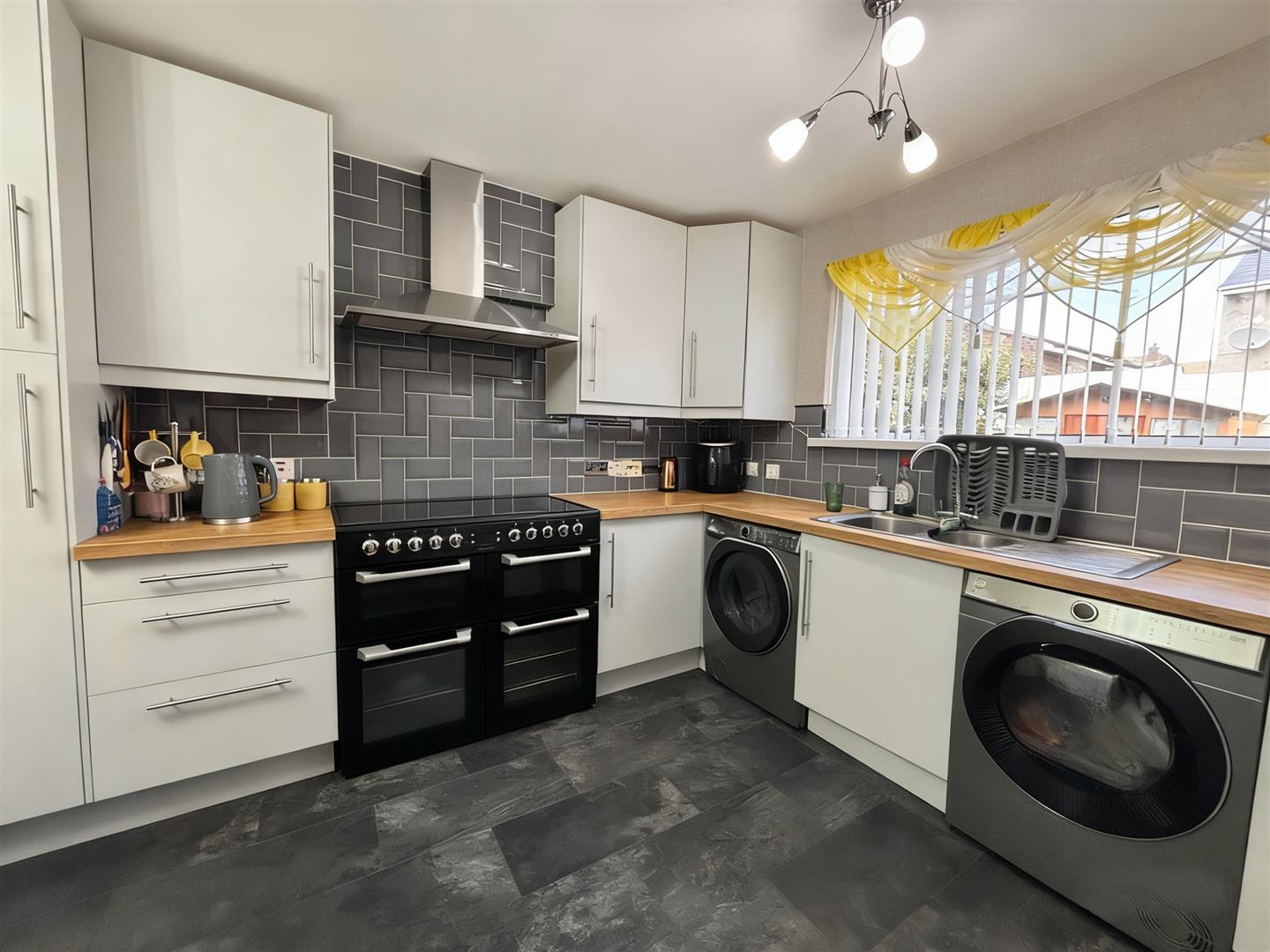 Bowl and a half single drainer stainless steel sink unit, extensive range of high and low level units, wooden worktops, built-in range style cooker, integrated fridge freezer space, stainless steel extractor fan, plumbed for washing machine, partly tiled walls.