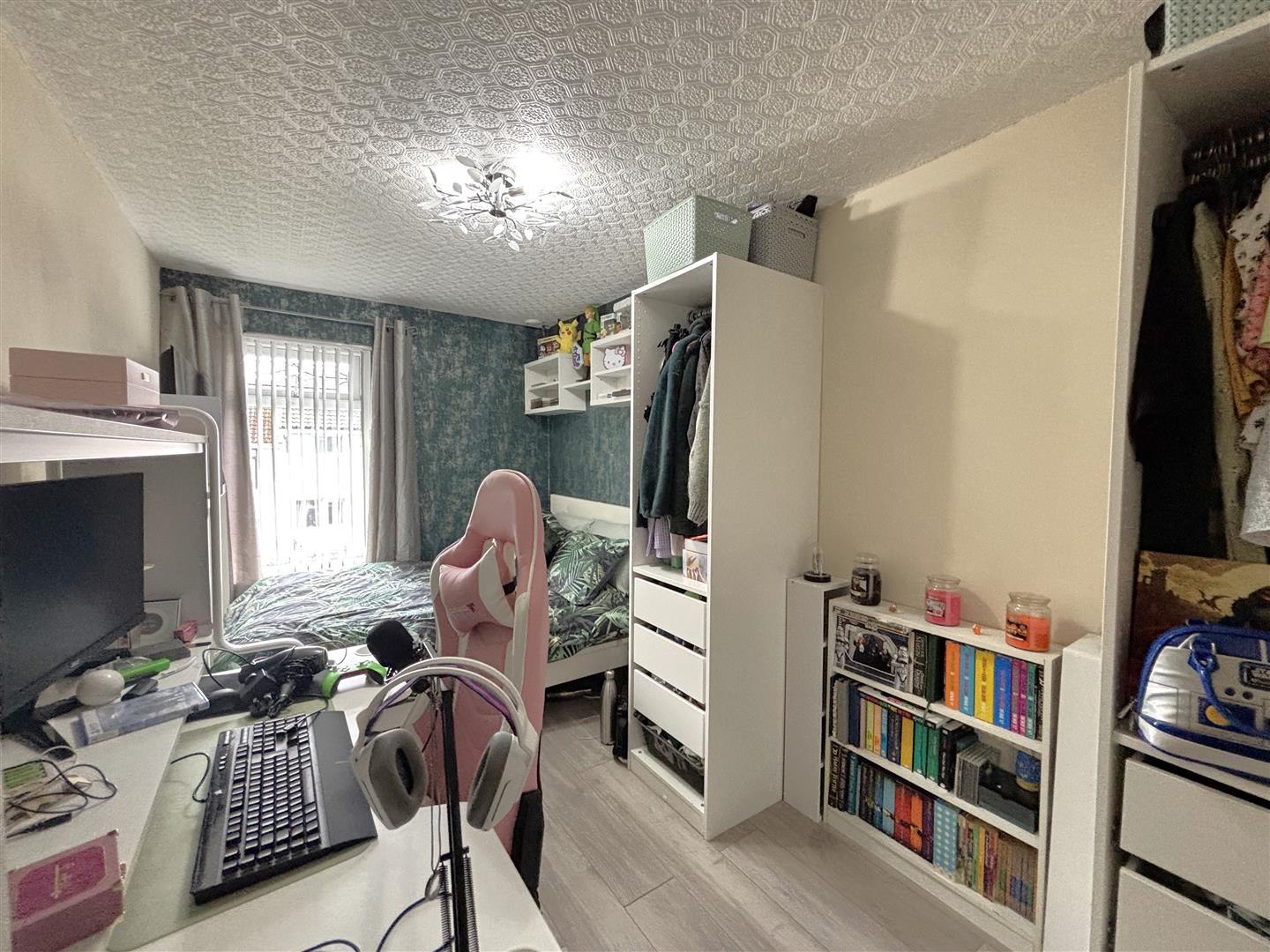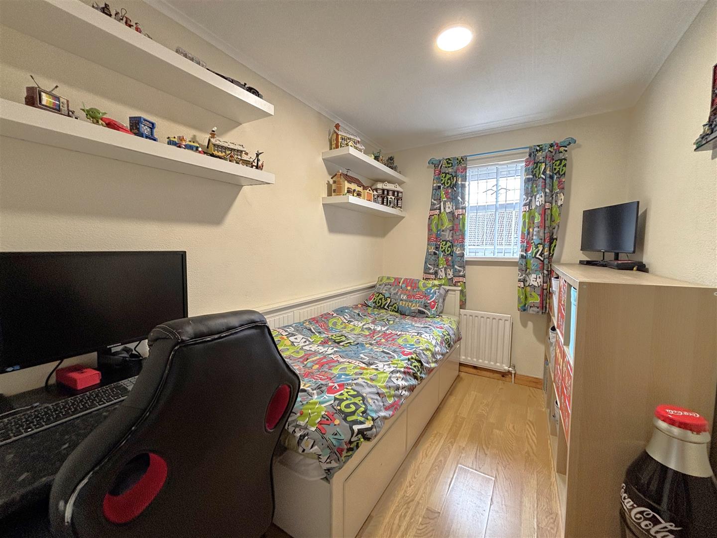 Built-in cupboard x 2, ceramic tiled floor, double panelled radiator, hardwood door to rear.