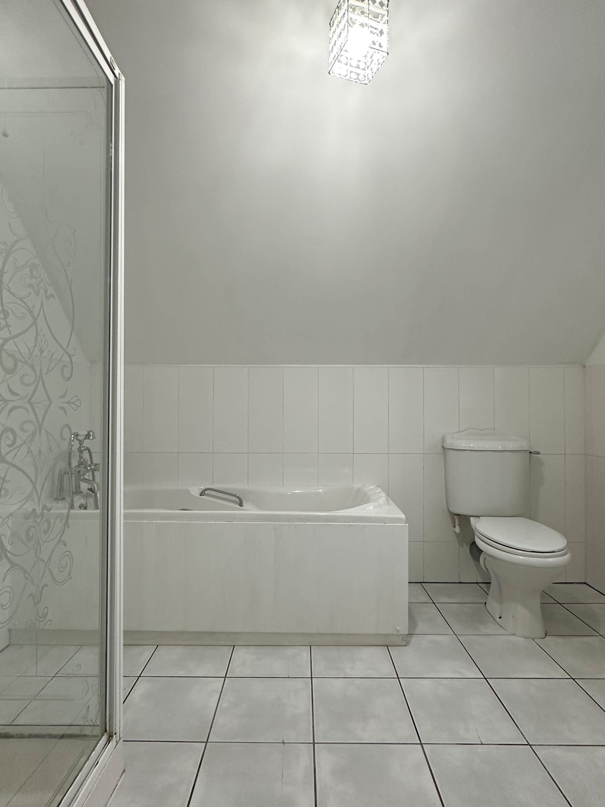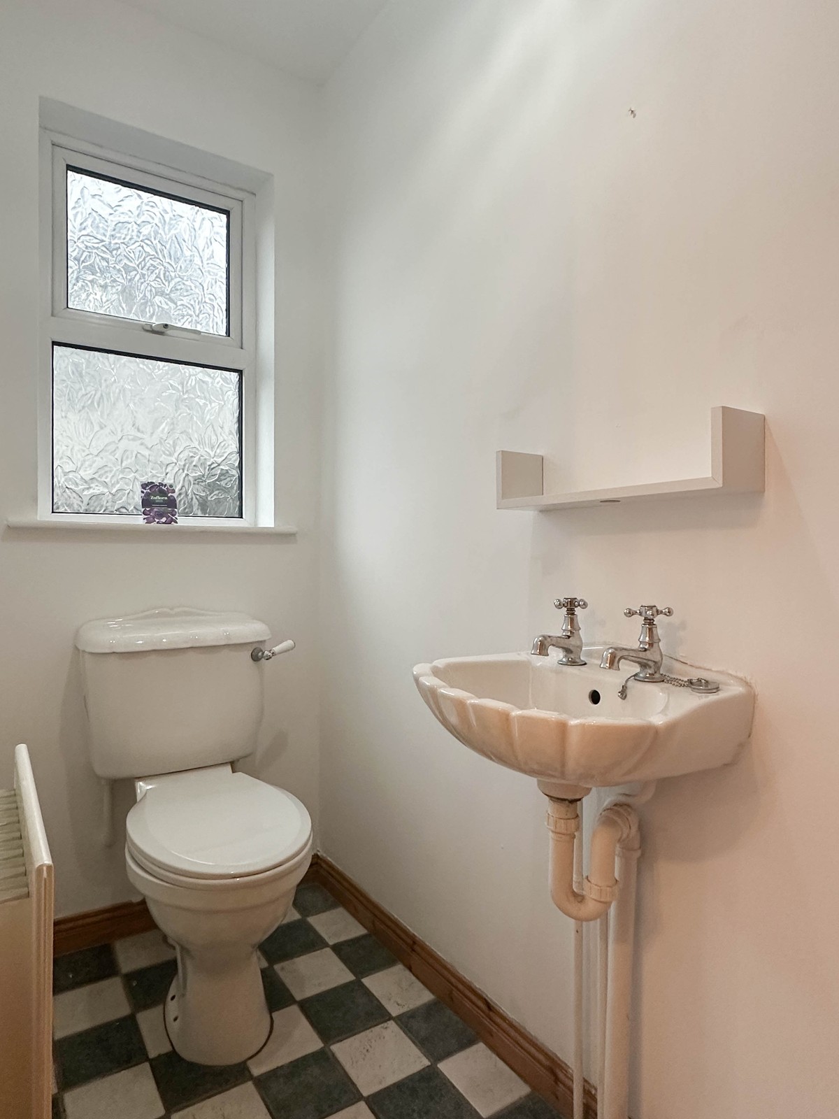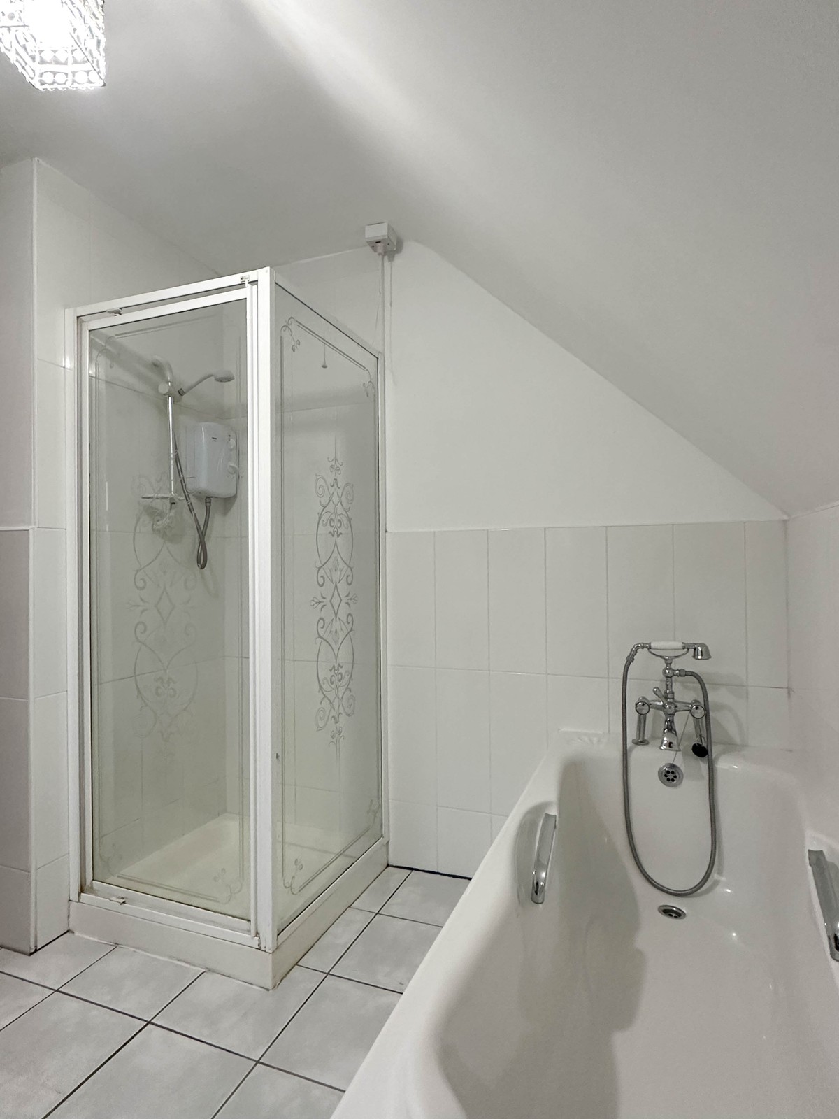 Comprising wooden panel bath with telephone hand shower, wash hand basin, w.c., tiled corner shower cubicle with Triton electric shower fitting, half tiled walls, extractor fan, tiled floor.