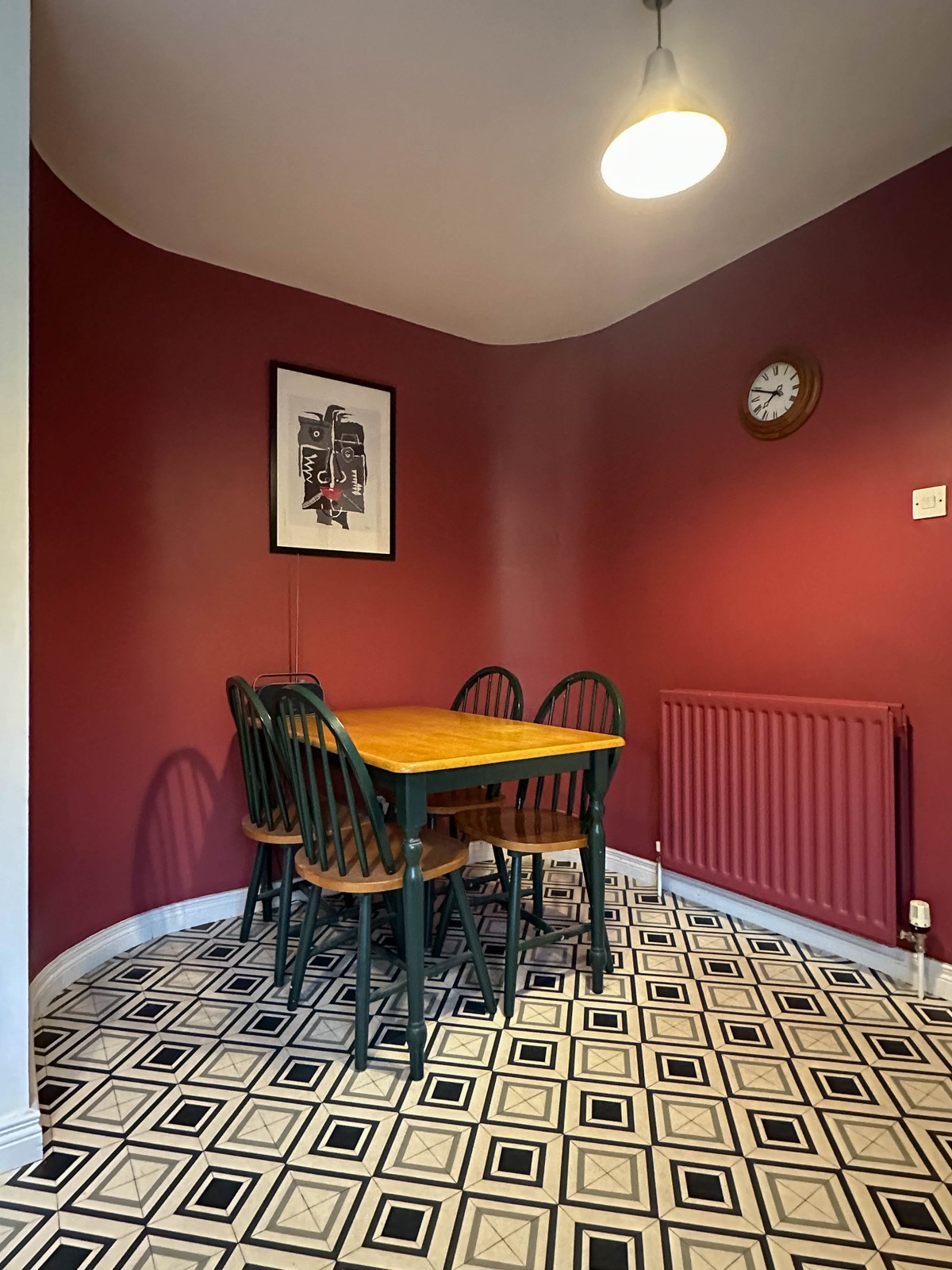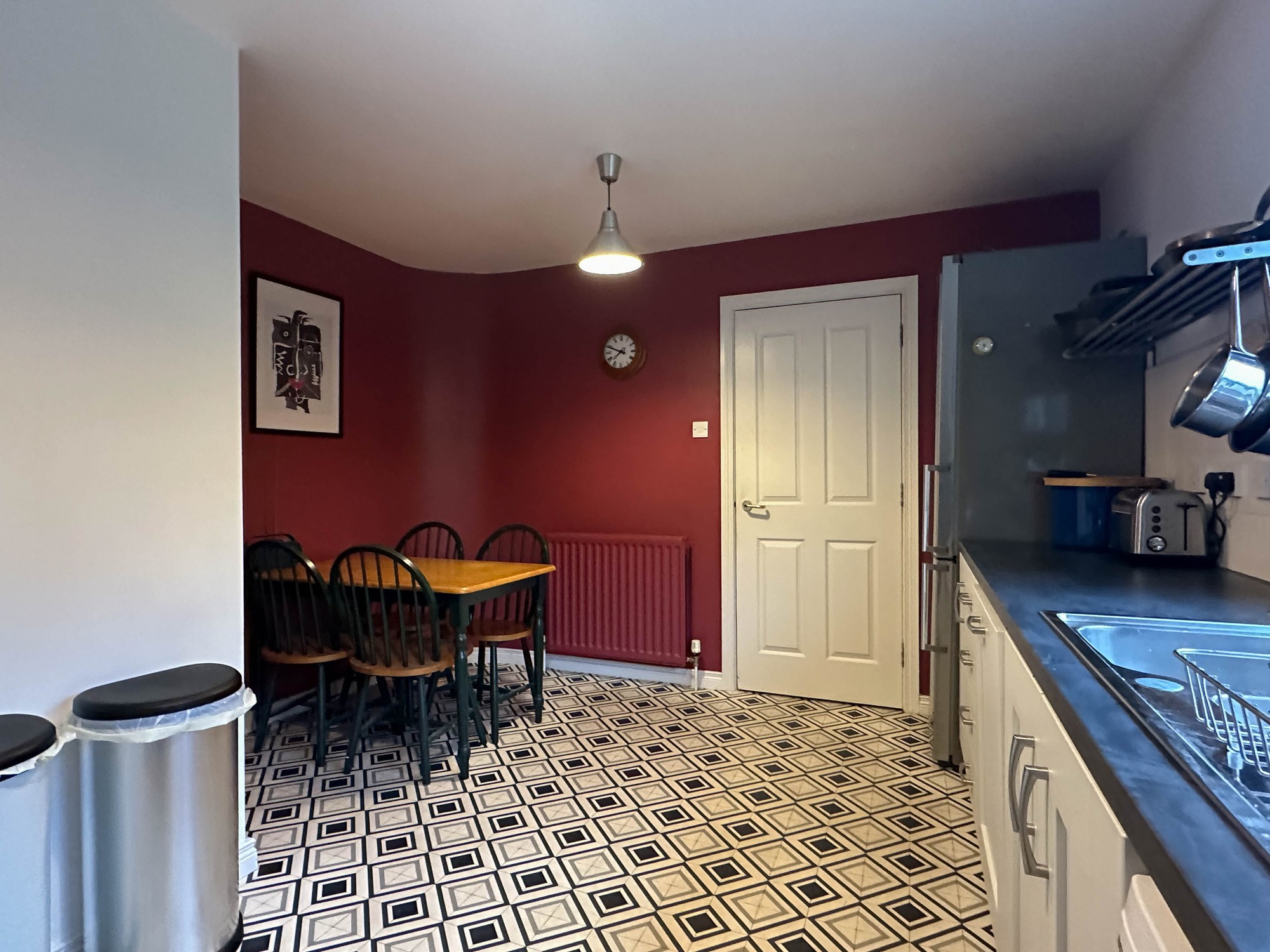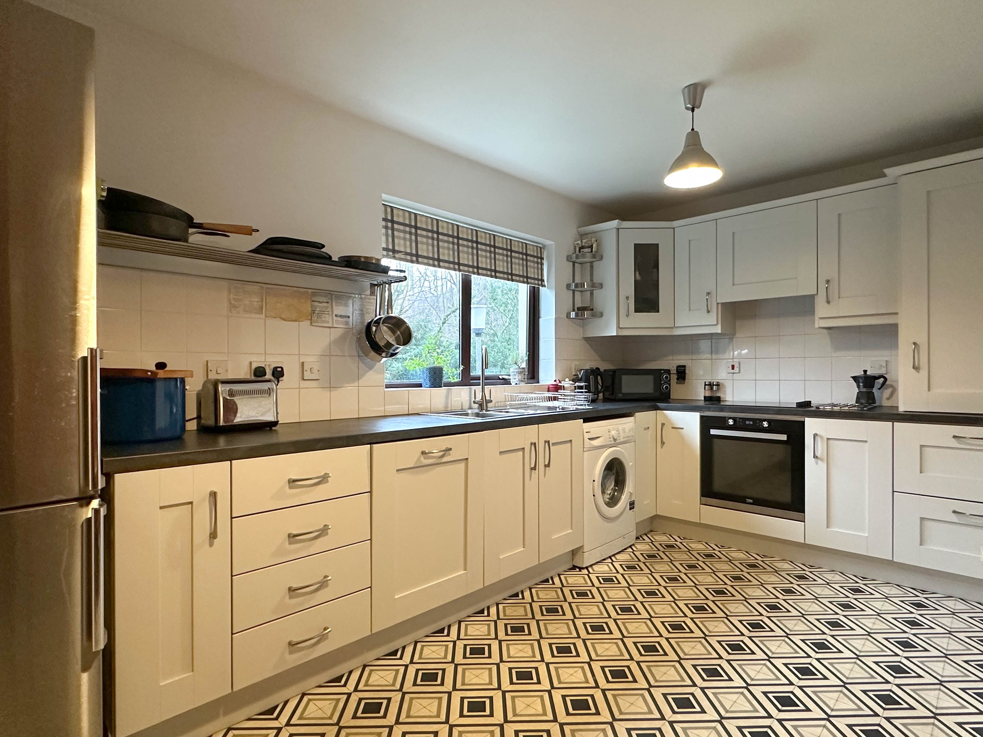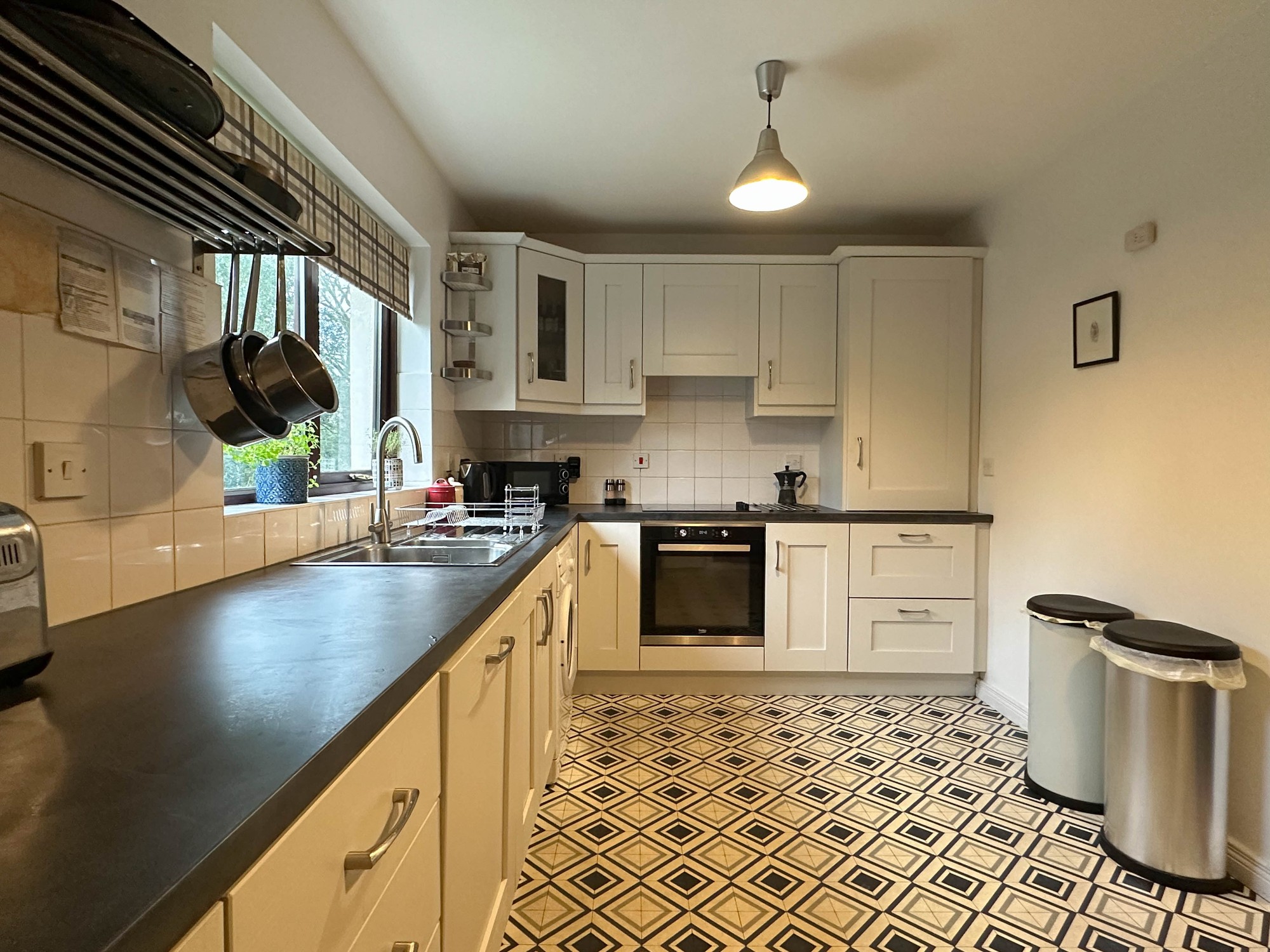 (Max) with eye and low level units including saucepan drawers, tiled between units, one and a half bowl stainless steel sink unit, Beko oven and hob, integrated Beko dishwasher, space for fridge / freezer, plumbed for washing machine, housing for gas boiler, extractor fan.