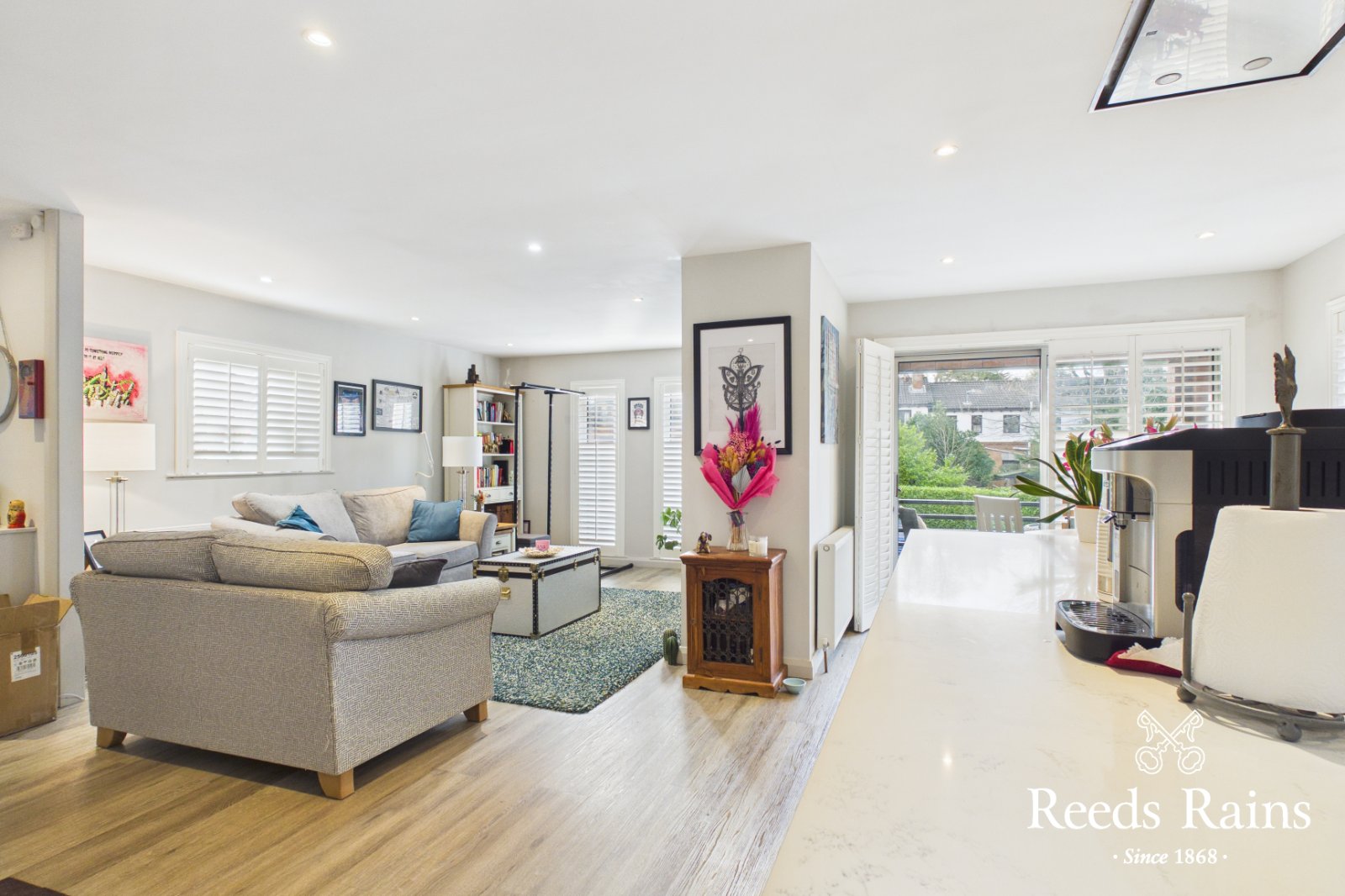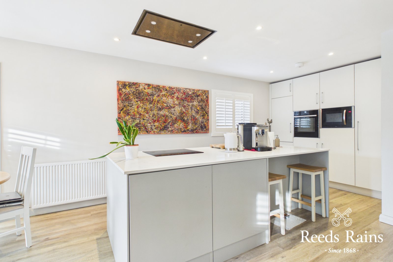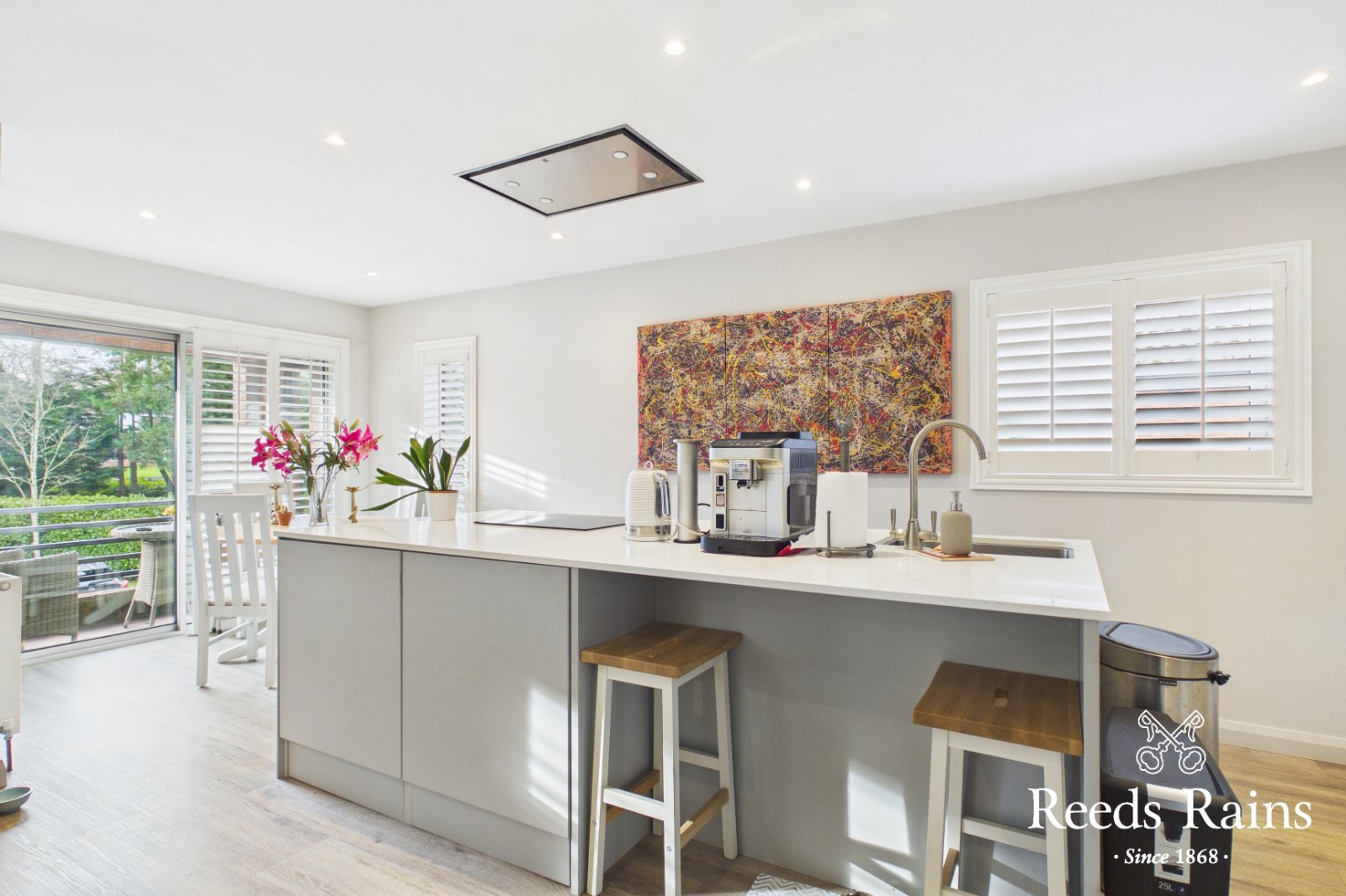 Excellent range of high and low level units, stainless steel built in oven, stainless steel built in microwave, built in larder cupboard, integrated fridge freezer, integrated washing machine, integrated dishwasher, recessed spotlights, laminate wooden floor, central island with quartz work surfaces, stainless steel bowl and one half sink unit with mixer taps, four ring ceramic hob with ceiling extractor fan, breakfast bar.