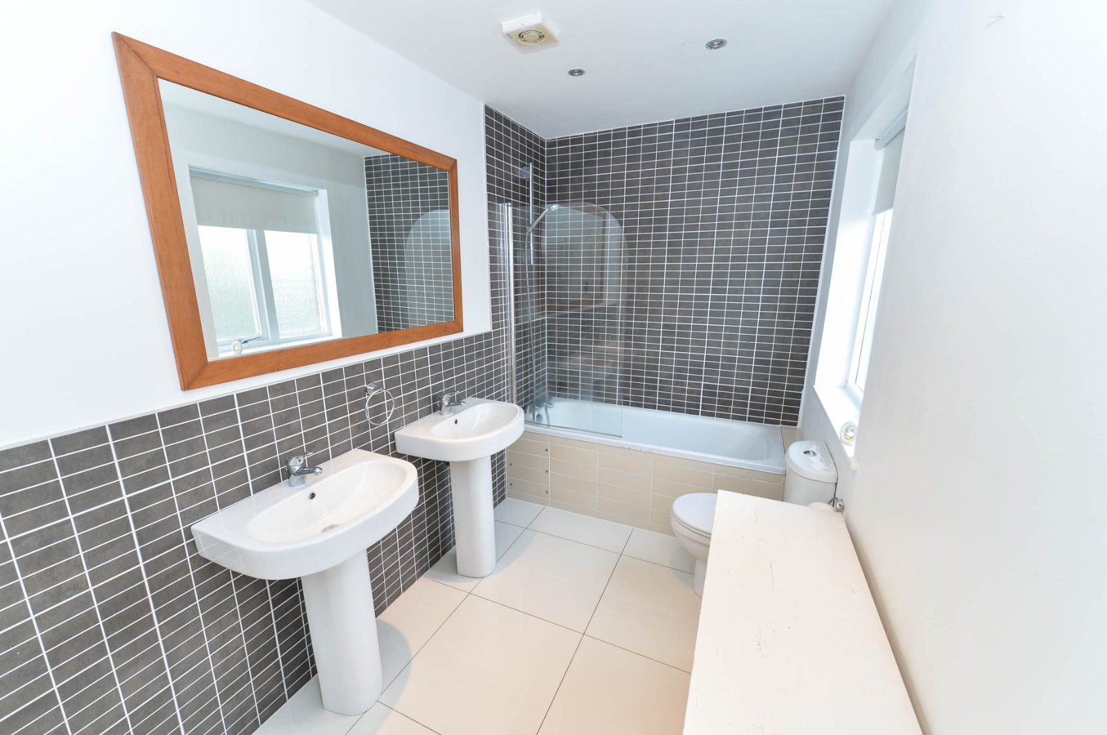 White suite, panel bath with overhead shower and shower screen. Dual pedestal wash hand basins. Wall radiator. Tiled floor. Inset mirror. Low flush WC. Part tiled walls.