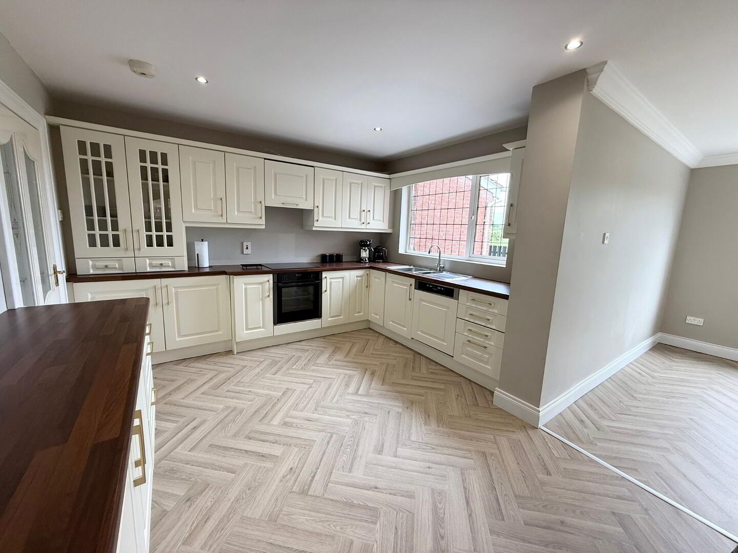 Spacious family kitchen with a range of high and low units, laminate flooring, integrated appliances including dishwasher, oven with electric hob and extractor fan, and stainless steel sink. Open-plan access to the dining area and utility room. Finished with ceiling spotlights and ceiling coving.